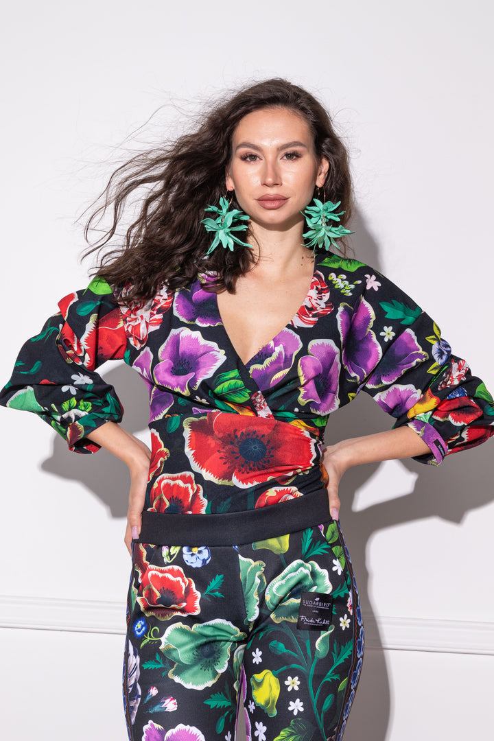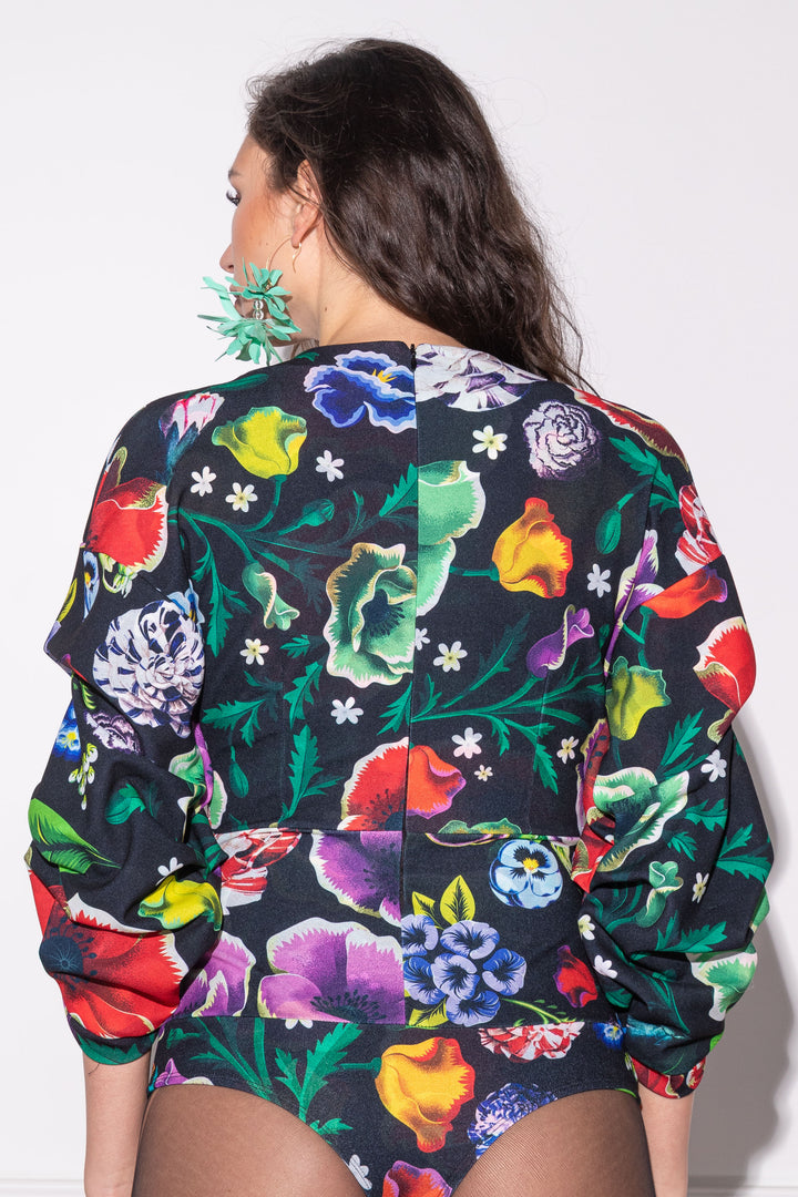 Háromnegyedes és enyhén puffos ujjú, alak követő body. Elején „V” kivágású és átlapolt, mell alatt, valamint az ujján hajtások formázzák. Háta közepén zipzárral nyitható. Alján gumizott combrésszel és állítható patentos kapoccsal záródik. Ujjára SUGARBIRD feliratú címkét varrtunk.