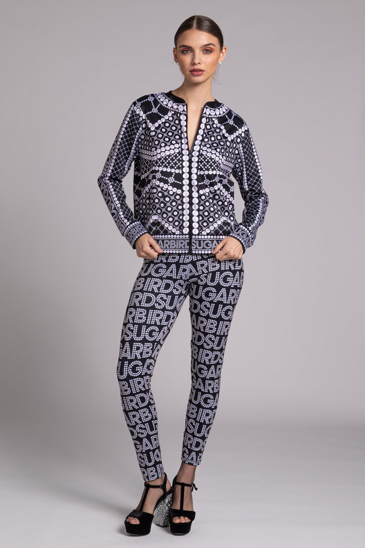 Hosszú ujjú, csípőig érő, egyenes fazonú dzseki. Nyakát rászabott gallér, alját és ujja alját félbehajtott pántok szegik. Az eleje közepén zipzárral nyílik, oldalaiba zsebeket helyeztünk. Hátán fehér masnis kellék és SUGARBIRD feliratú címke díszíti.