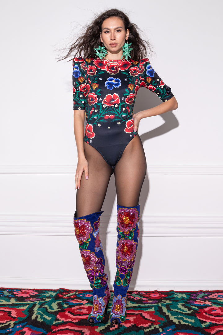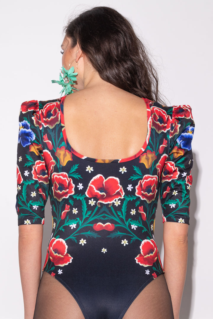 Háromnegyedes, enyhén puffos ujjú, alak követő body. Elején zárt, hátán mélyen és ívesen kivágott nyakát keskeny pánt szegi, alján gumizott combrésszel és állítható patenttal záródik. A háta akár az elejének is hordható! A fazon ujjára SUGARBIRD feliratú címkét varrtunk.
