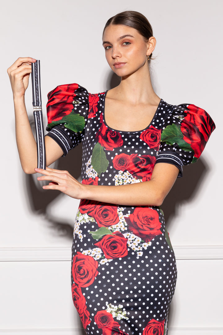 Rövid és puffos ujjú, vádliközép hosszúságú, alak követő ruha. Nyaka mélyen dekoltált, melyet keskeny pánt szeg el. Hátára SUGARBIRD feliratú címkét varrtunk. A ruhához egy különálló gumis öv is készült, amely fém övcsattal záródik.