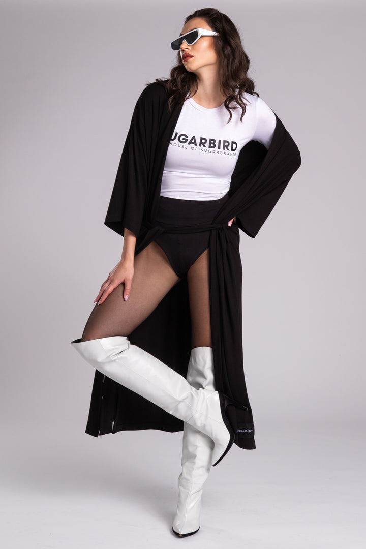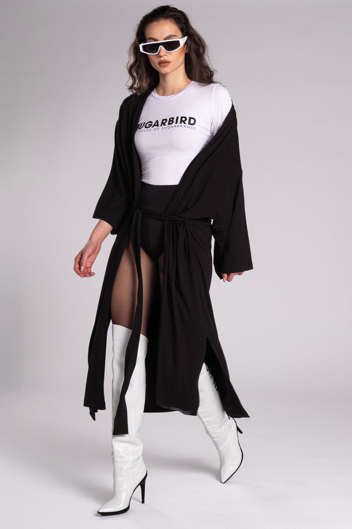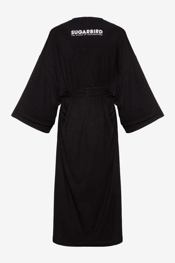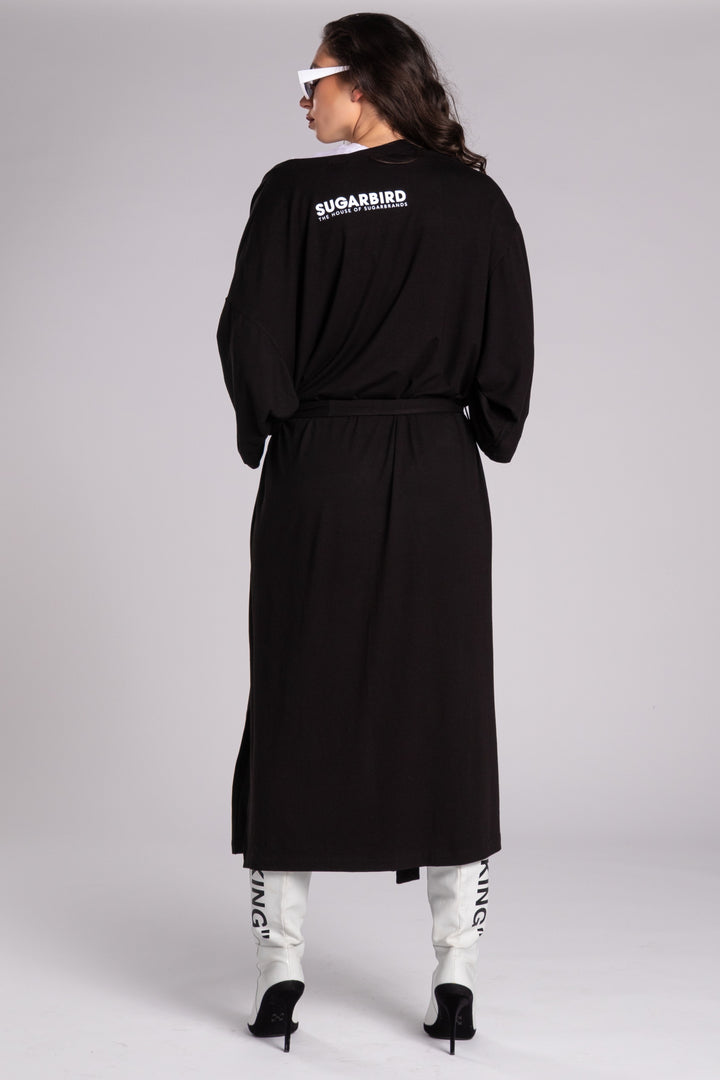 Hosszú ujjú, maxi hosszúságú, bő és egyenes fazonú kaftán. Derekát hosszú, kötős öv, elején SUGARBIRD feliratú címke díszíti.