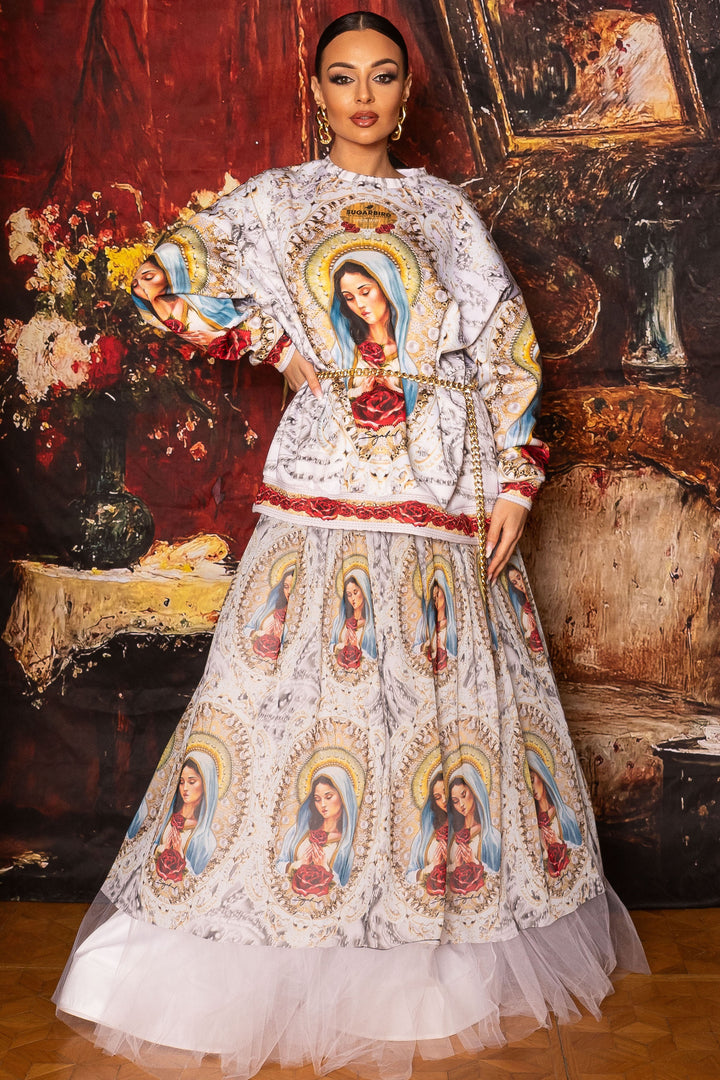 Fedezd fel új Vive Maria kollekciónk különleges darabjait, melyeken a festett Szűz Mária portré és annak motívumai jelennek meg printelt mintaként.