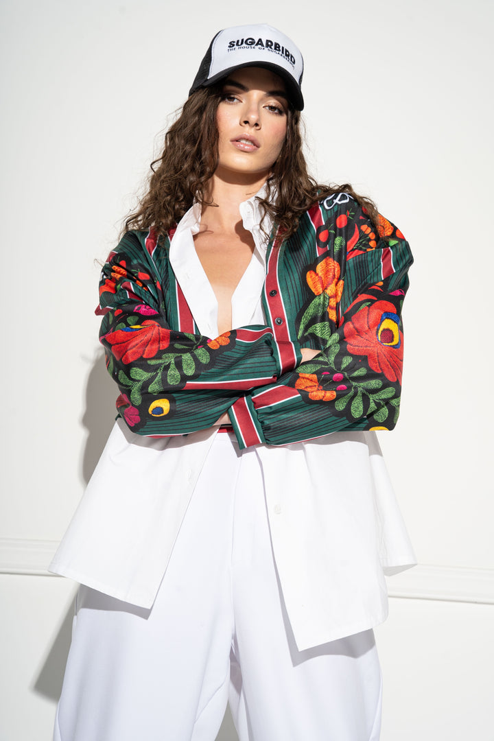 Derék alá érő, hosszú és bő ujjú, laza fazonú felső. Elején patentokkal záródik. Hátára szövött szalaggal ellátott SUGARBIRD feliratú címkével díszítettük.