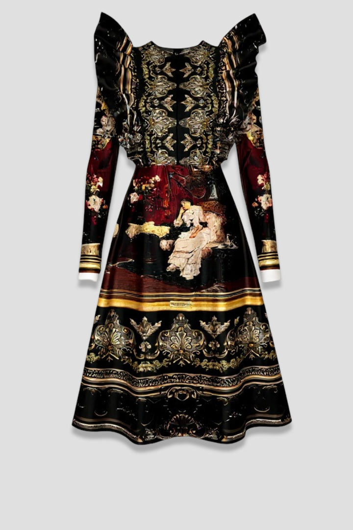 Térd alatti hosszúságú, hosszú ujjú ruha. Felső részén alak követő és bélelt, szoknyarészén bővülő, „A” vonalú. Vállait széles, húzott fodor díszíti. Eleje közepén, derékig zipzárral nyitható.
