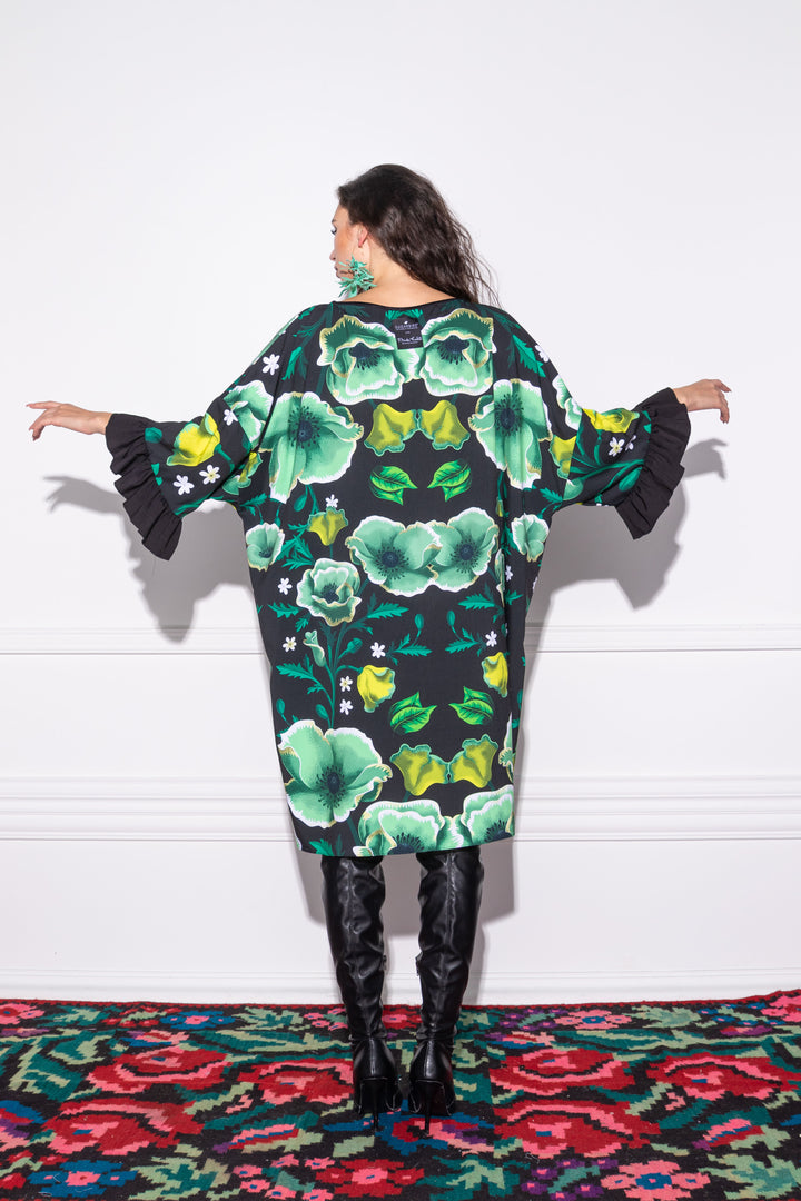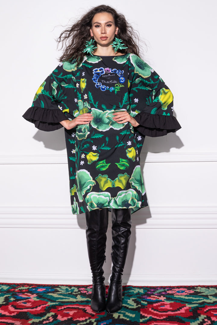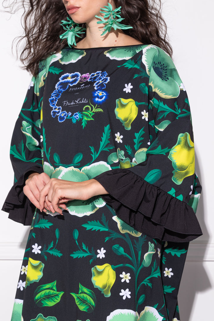 Hosszú ujjú, térdig érő, extra laza és bő fazonú tunika. Széles „csónak” kivágású nyaka keskeny pánttal szegett. Ujja alján húzott fodor díszíti. Hátára SUGARBIRD LOVES FRIDA KAHLO feliratú címkét varrtunk.