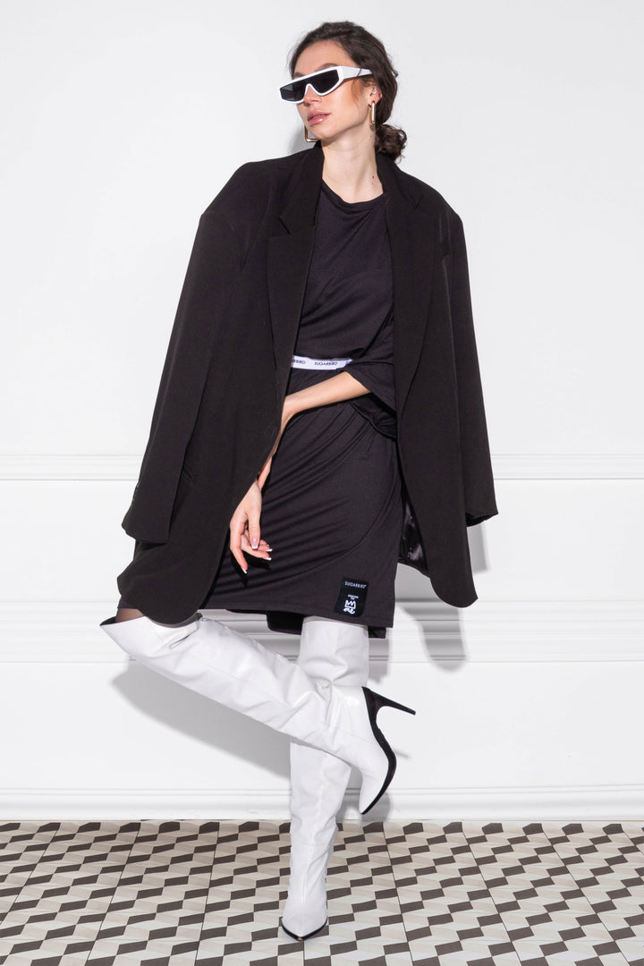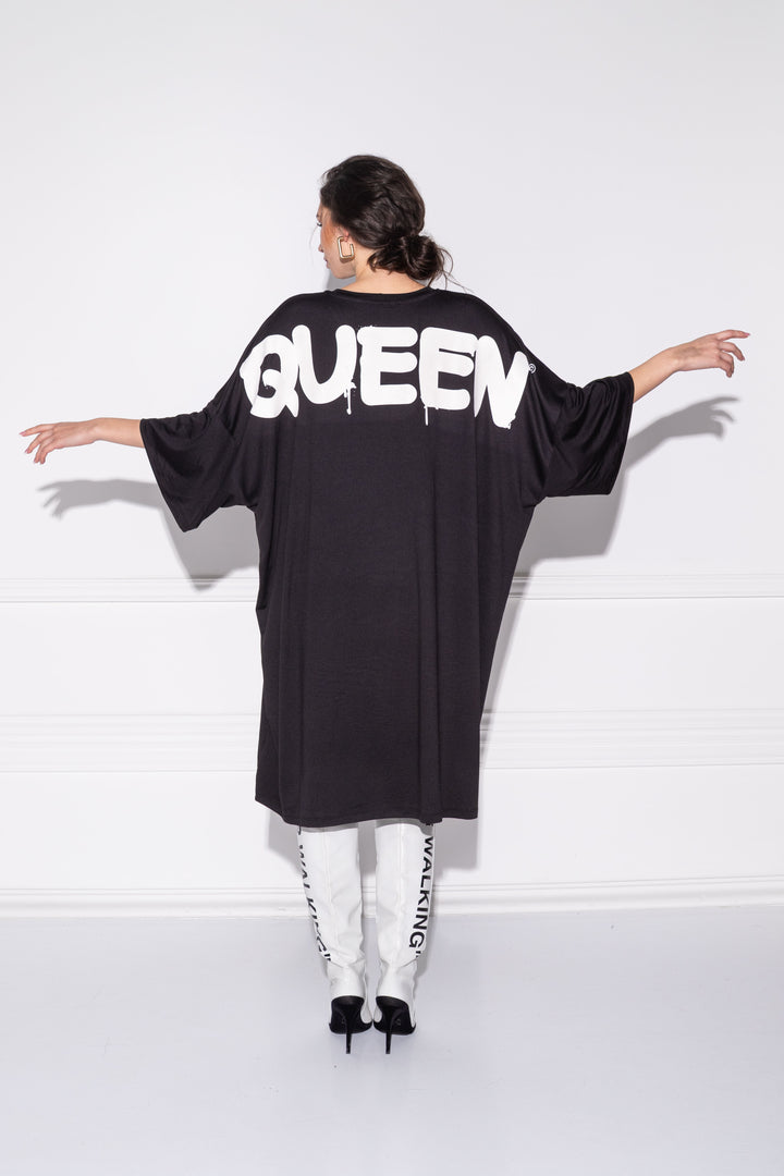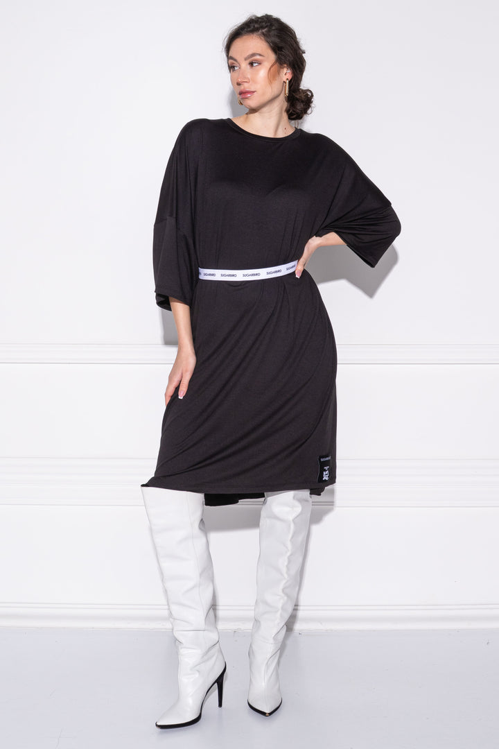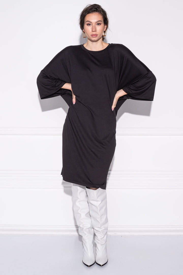 Rövid ujjú, térdig érő, extra laza és bő fazonú tunika. Zárt kerek nyaka félbehajtott pánttal szegett.