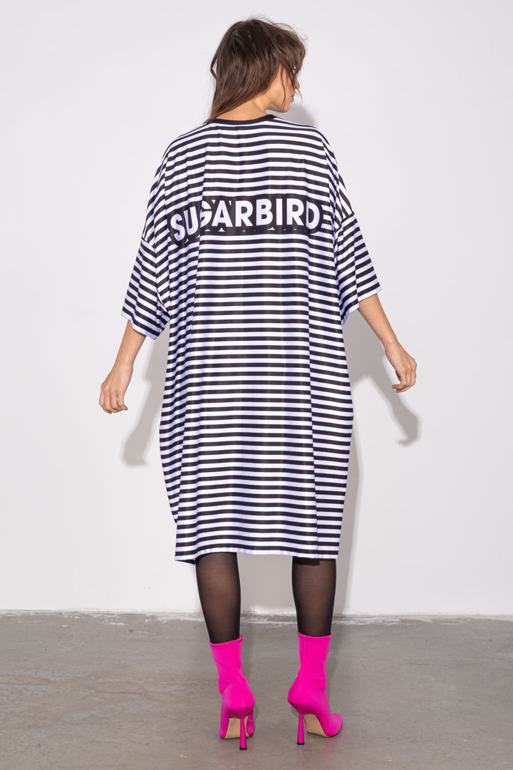 Rövid ujjú, térdig érő, extra laza és bő fazonú tunika. Zárt kerek nyaka félbehajtott pánttal szegett. A fazont az oldalán SUGARBIRD feliratú címkével díszítettük.