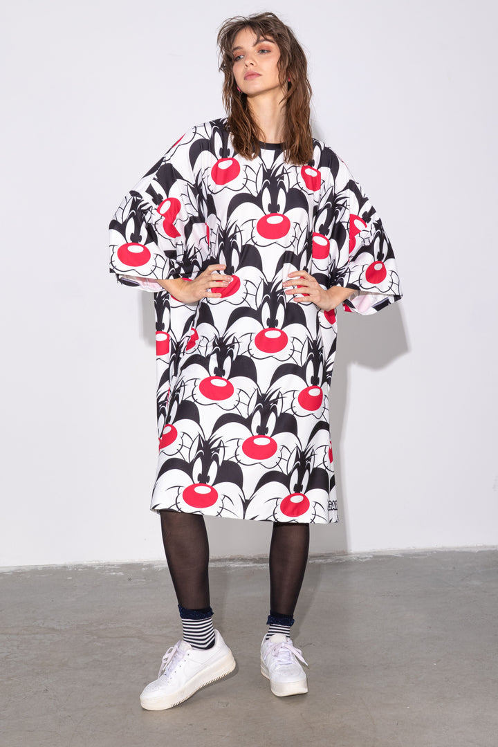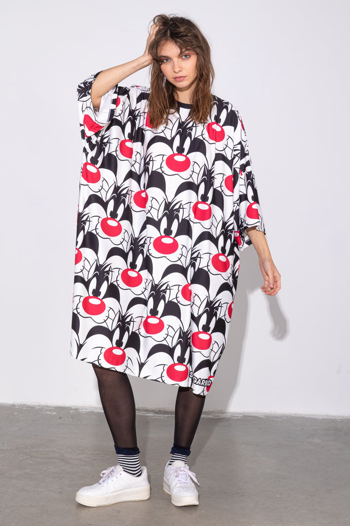 Rövid ujjú, térdig érő, extra laza és bő fazonú tunika. Zárt kerek nyaka félbehajtott pánttal szegett. A fazont az oldalán SUGARBIRD feliratú címkével díszítettük.