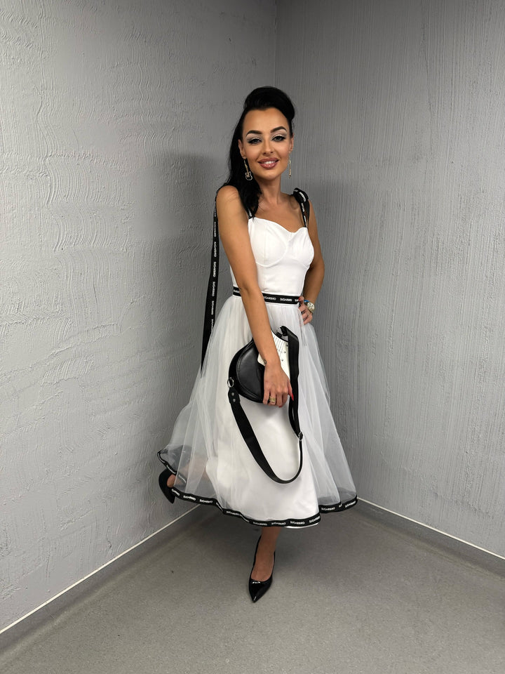 Vádliközép hosszúságú, felső részén alak követő, tüllözött szoknya részén bő szabású, bélelt ruha. Mell része szabott, SUGARBIRD feliratú szalagból készült vállpántjai méretre köthetők. Háta közepén zipzárral nyílik. Szoknya része a derekán húzott, felette, valamint az alján körben SUGARBIRD feliratú szalag fut. Elejére SUGARBIRD feliratú címkét varrtunk.