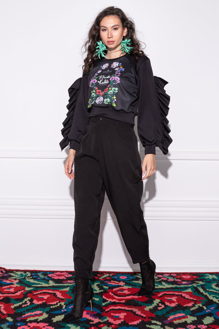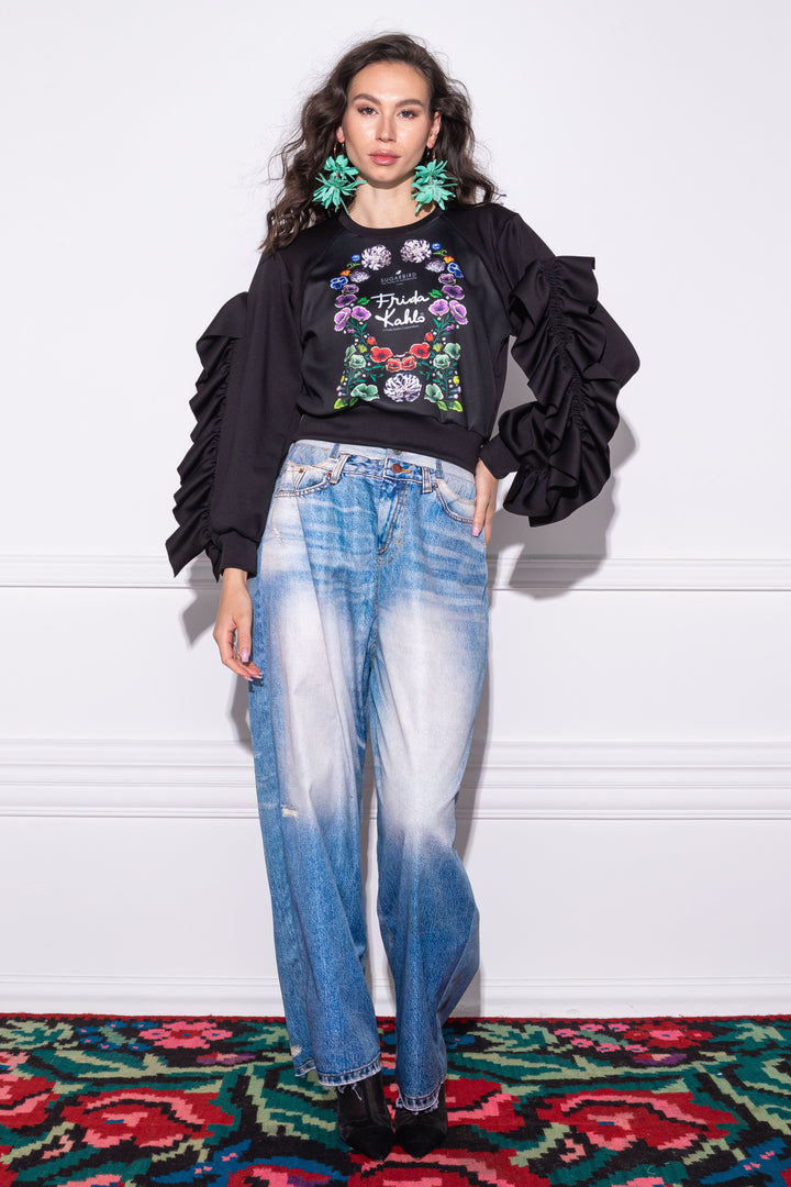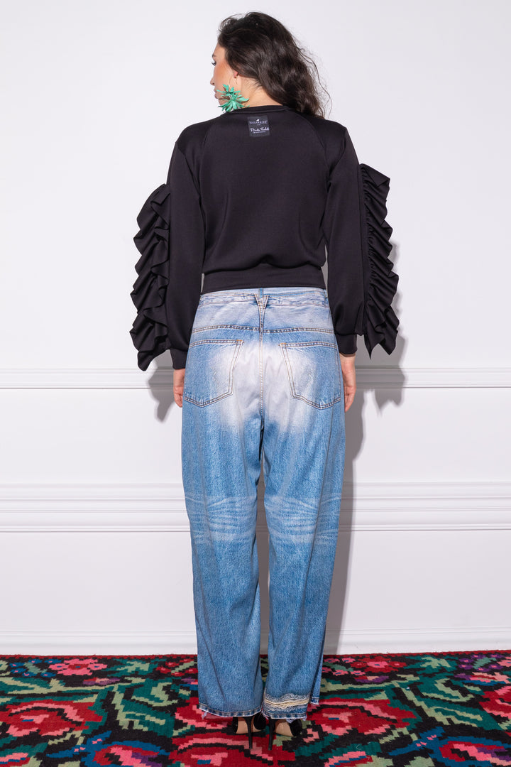 Hosszú ujjú, Derék alá érő, laza fazonú felső. Kerek nyakát, alját és ujja alját félbehajtott pántok szegik. Ujjait széles fodrok díszítik, hátára SUGARBIRD feliratú címkét varrtunk.