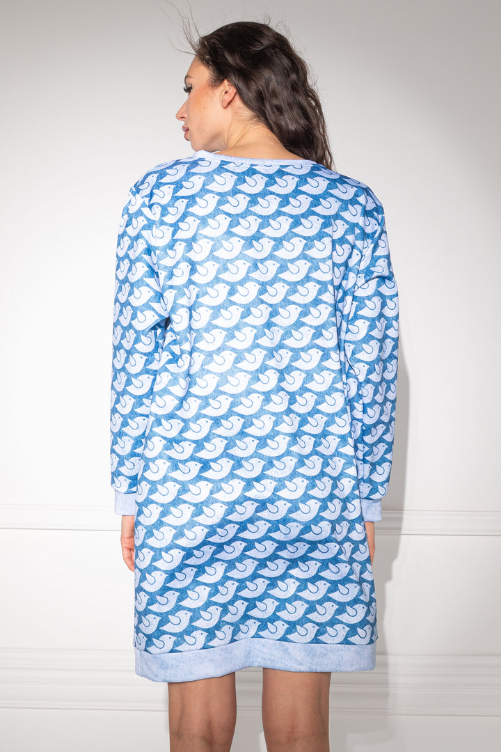 Hosszú ujjú, combközép hosszúságú, laza és egyenes fazonú tunika. Zárt kerek nyaka félbehajtott pánttal szegett. Elejére szövött szalaggal ellátott SUGARBIRD feliratú címkét varrtunk.