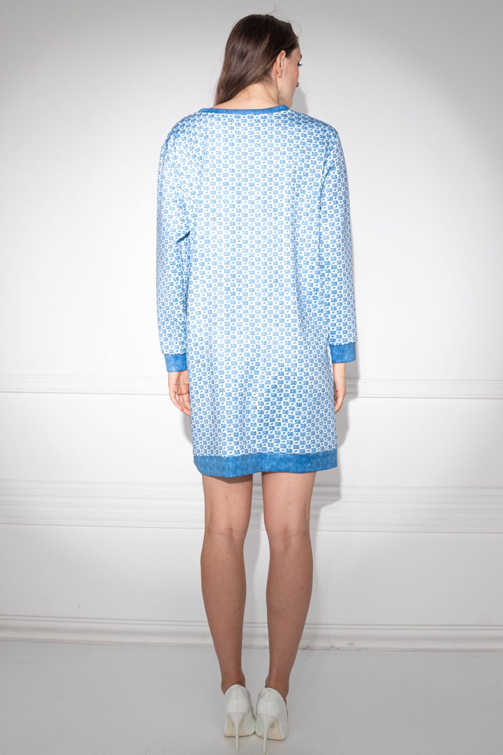 Hosszú ujjú, combközép hosszúságú, laza és egyenes fazonú tunika. Zárt kerek nyaka félbehajtott pánttal szegett. Elejére szövött szalaggal ellátott SUGARBIRD feliratú címkét varrtunk.