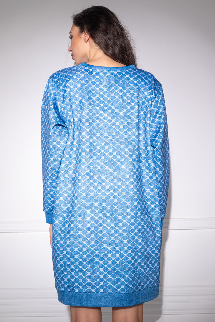 Hosszú ujjú, combközép hosszúságú, laza és egyenes fazonú tunika. Zárt kerek nyaka félbehajtott pánttal szegett. Elejére szövött szalaggal ellátott SUGARBIRD feliratú címkét varrtunk.