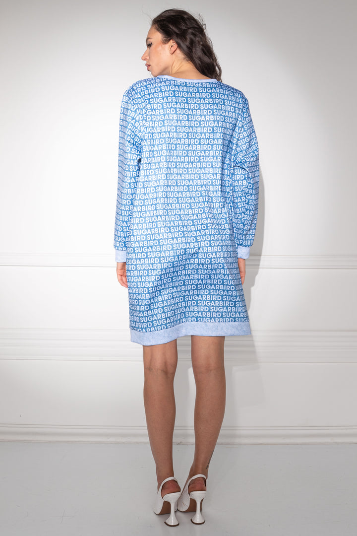 Hosszú ujjú, combközép hosszúságú, laza és egyenes fazonú tunika. Zárt kerek nyaka félbehajtott pánttal szegett. Elejére szövött szalaggal ellátott SUGARBIRD feliratú címkét varrtunk.