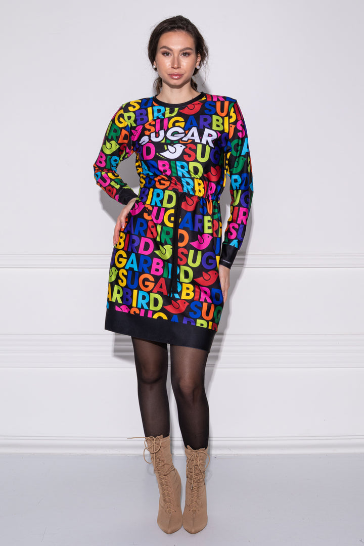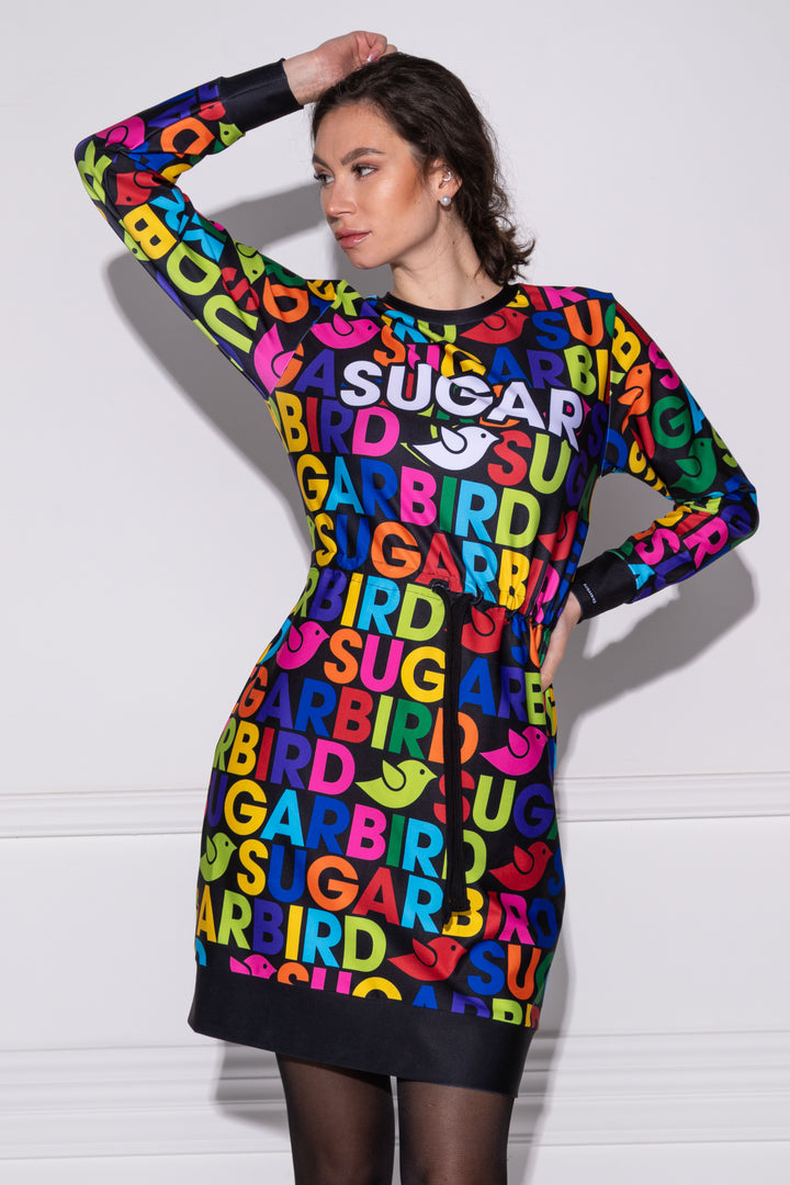 Hosszú ujjú, laza fazonú, combközépig érő tunika. Zárt kerek nyakát, alját és ujja alját félbehajtott pánt szegi. Dereka egy széles kötő által szűkíthető. A fazonra SUGARBIRD feliratú címkét varrtunk.
