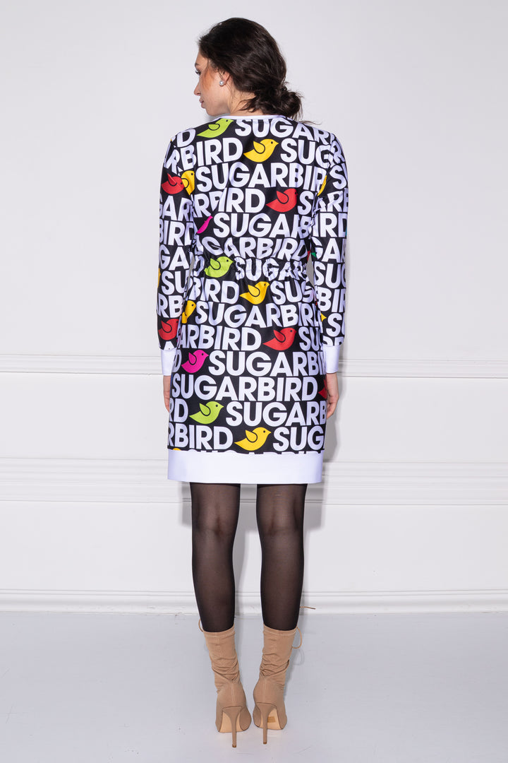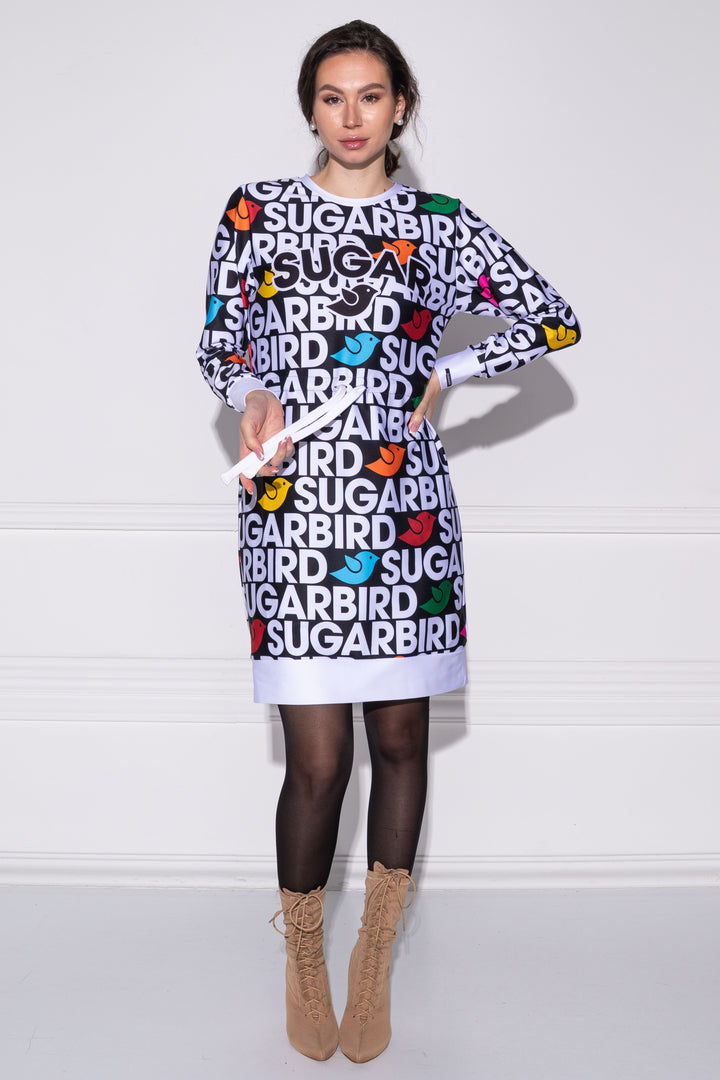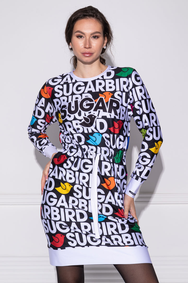 Hosszú ujjú, laza fazonú, combközépig érő tunika. Zárt kerek nyakát, alját és ujja alját félbehajtott pánt szegi. Dereka egy széles kötő által szűkíthető. A fazonra SUGARBIRD feliratú címkét varrtunk.