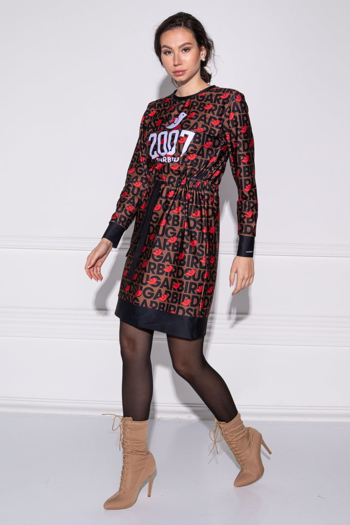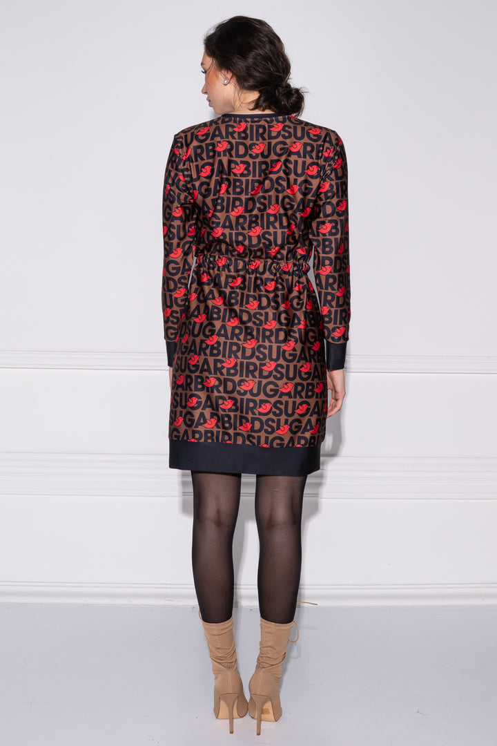 Hosszú ujjú, laza fazonú, combközépig érő tunika. Zárt kerek nyakát, alját és ujja alját félbehajtott pánt szegi. Dereka egy széles kötő által szűkíthető. A fazonra SUGARBIRD feliratú címkét varrtunk.