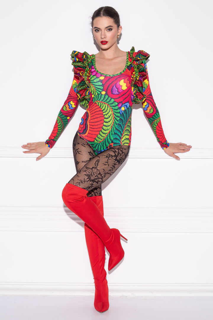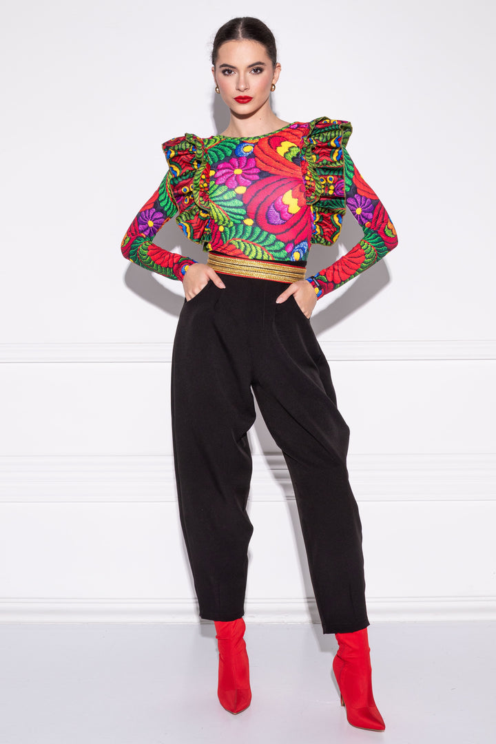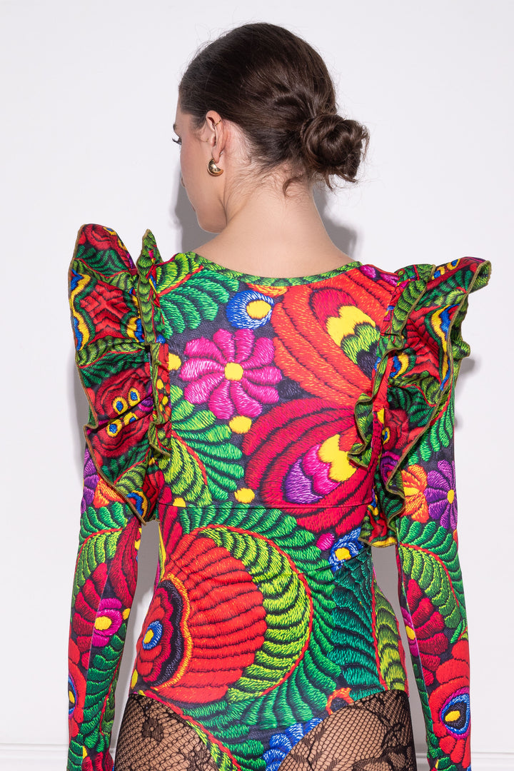 Elől zárt, hátán mély és íves nyakkivágású, alak követő, hosszú ujjú body, melynek nyakkörét félbehajtott pánt szegi. Vállait két-két széles, húzott fodor díszíti. Alul gumizott combrésszel, ülepén állítható kapoccsal záródik. A fazonra kicsi, SUGARBIRD feliratú címkét varrtunk.