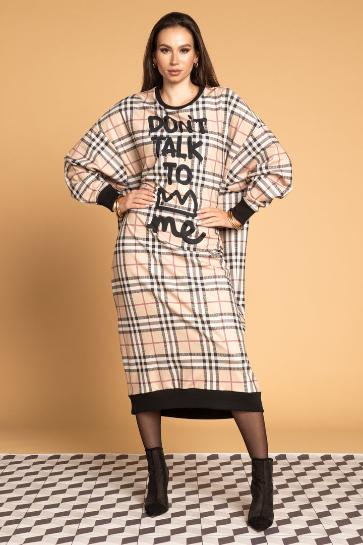 Hosszú ujjú, bő fazonú, vádliközép hosszúságú ruha. Oldalaiba zsebeket helyeztünk. Kerek nyakát, alját és ujja alját félbehajtott passzé anyagú pántok szegik. Hátán SUGARBIRD QUEEN ME feliratú címkével díszítettük.