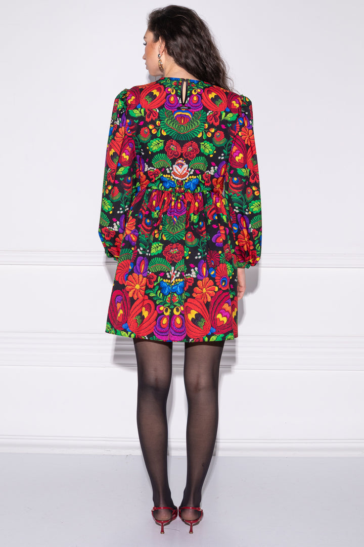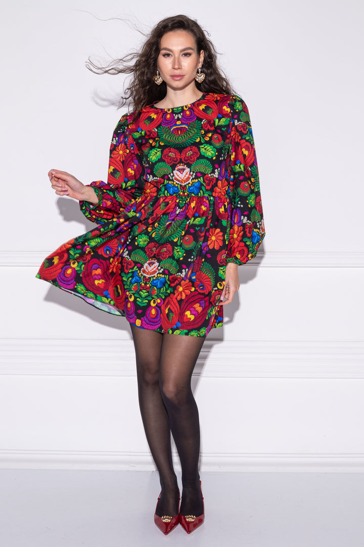 Hosszú és bő ujjú, térd feletti hosszúságú, laza fazonú ruha. Az ujja alján és a derekán gumizott, szoknya része húzott. Kerek, zárt nyakkivágása keskeny pánttal szegett, hátul a hasíték felett kapoccsal záródik. Hátára SUGARBIRD feliratú címkét varrtunk.