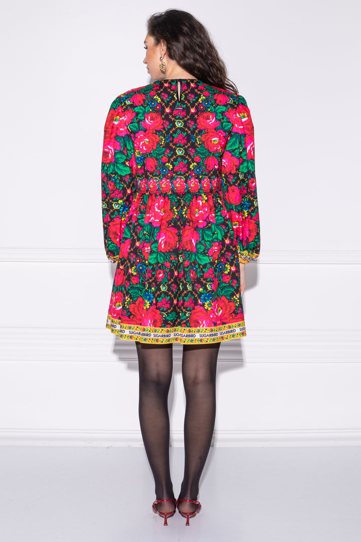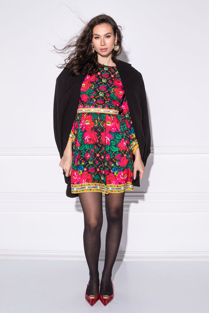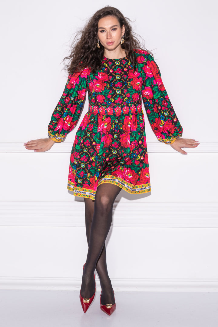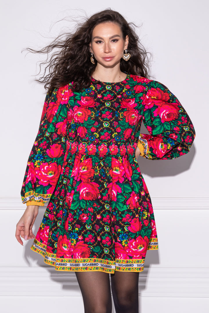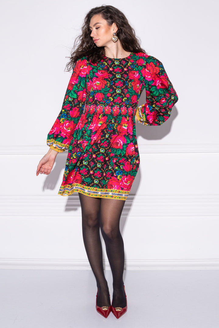 Hosszú és bő ujjú, térd feletti hosszúságú, laza fazonú ruha. Az ujja alján és a derekán gumizott, szoknya része húzott. Kerek, zárt nyakkivágása keskeny pánttal szegett, hátul a hasíték felett kapoccsal záródik. Hátára SUGARBIRD feliratú címkét varrtunk.