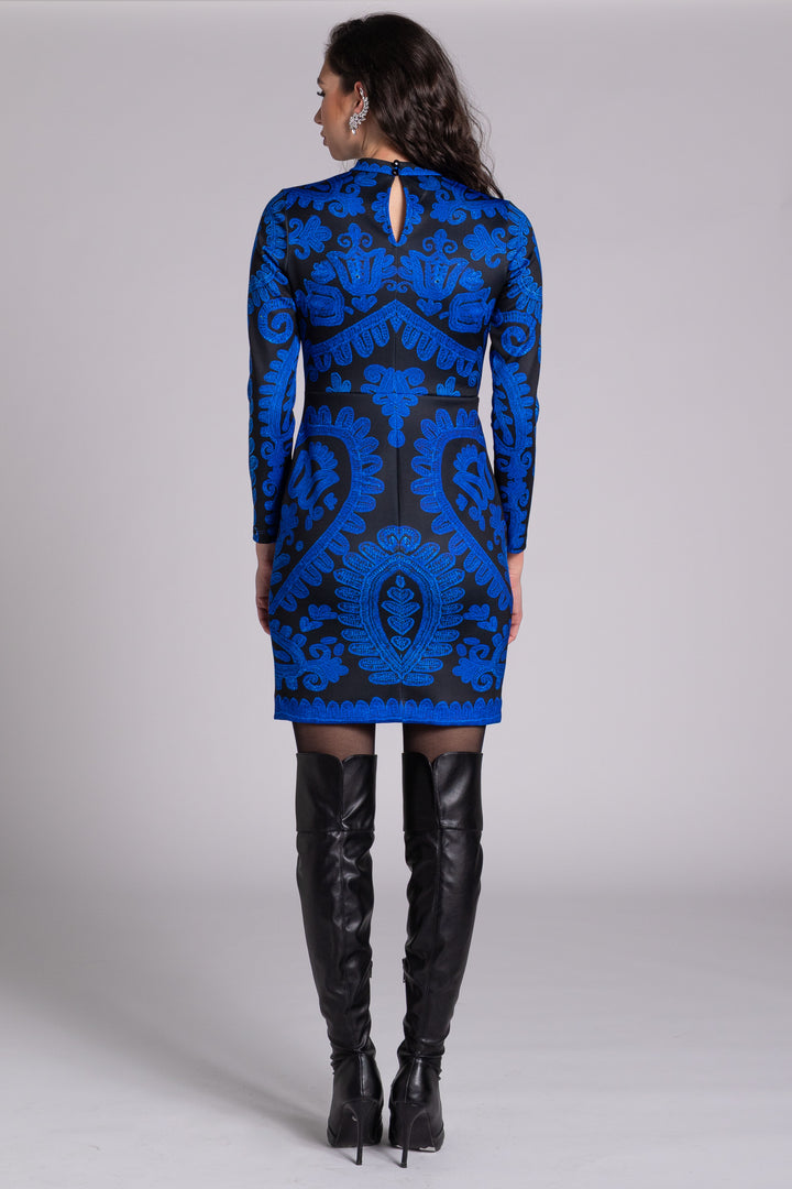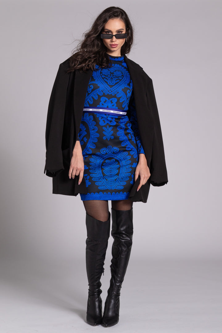 Hosszú ujjú, combközép hosszúságú, alak követő ruha. Nyakát álló gallér szegi, mely a hátán egy hasíték felett gombokkal záródik. Ujjára SUGARBIRD feliratú címkével díszítettük.