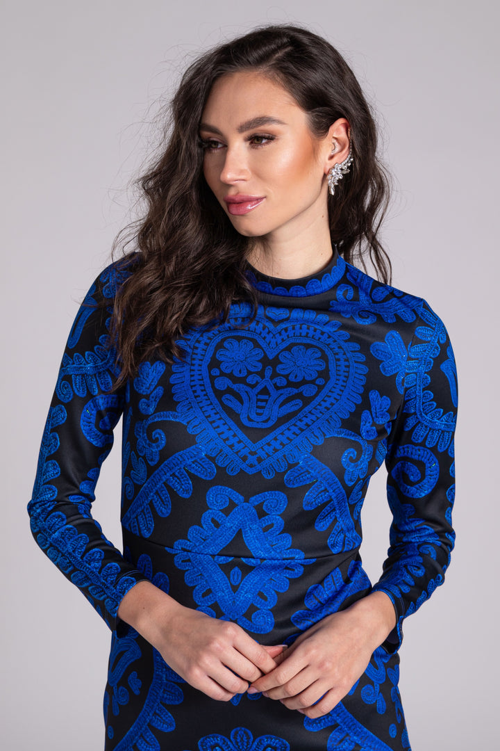 Kollekciónk mintáját az Erdélyben található kalotaszegi írottas hímzés alapján készült, fekete alapra kék színnel printelt grafikák díszítik.
