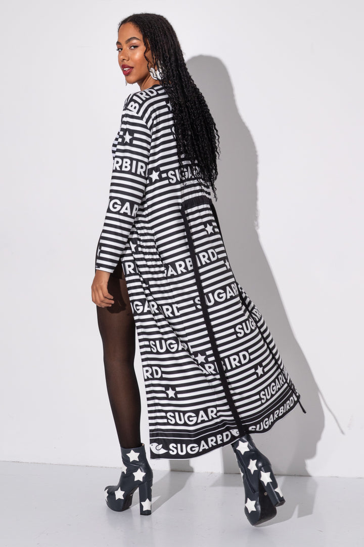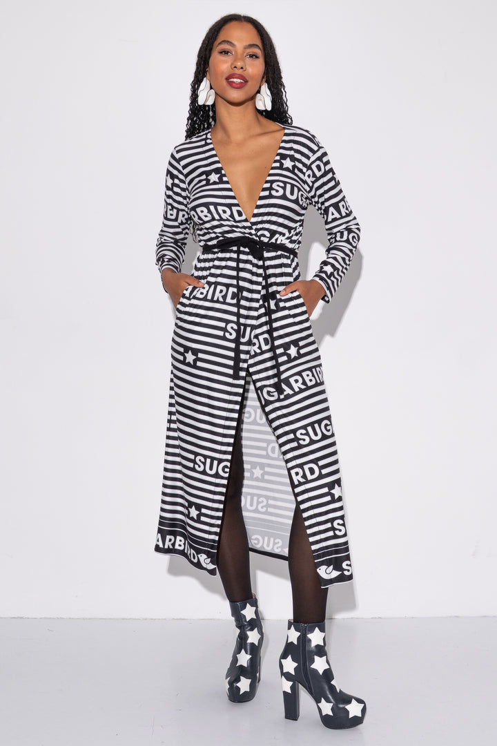 Kollekción darabjait fekete és fehér csíkos alapon SUGARBIRD feliratok printelt mintája díszíti.