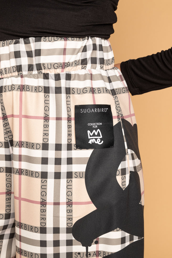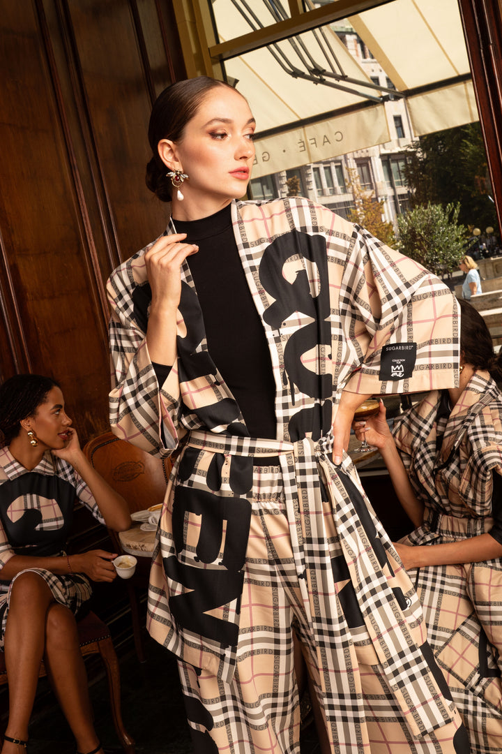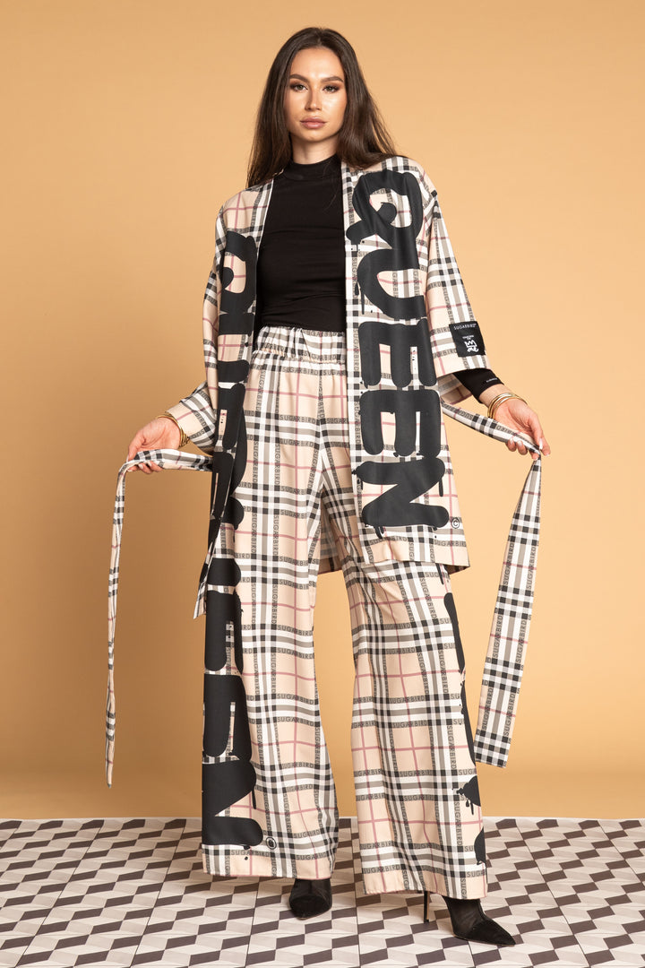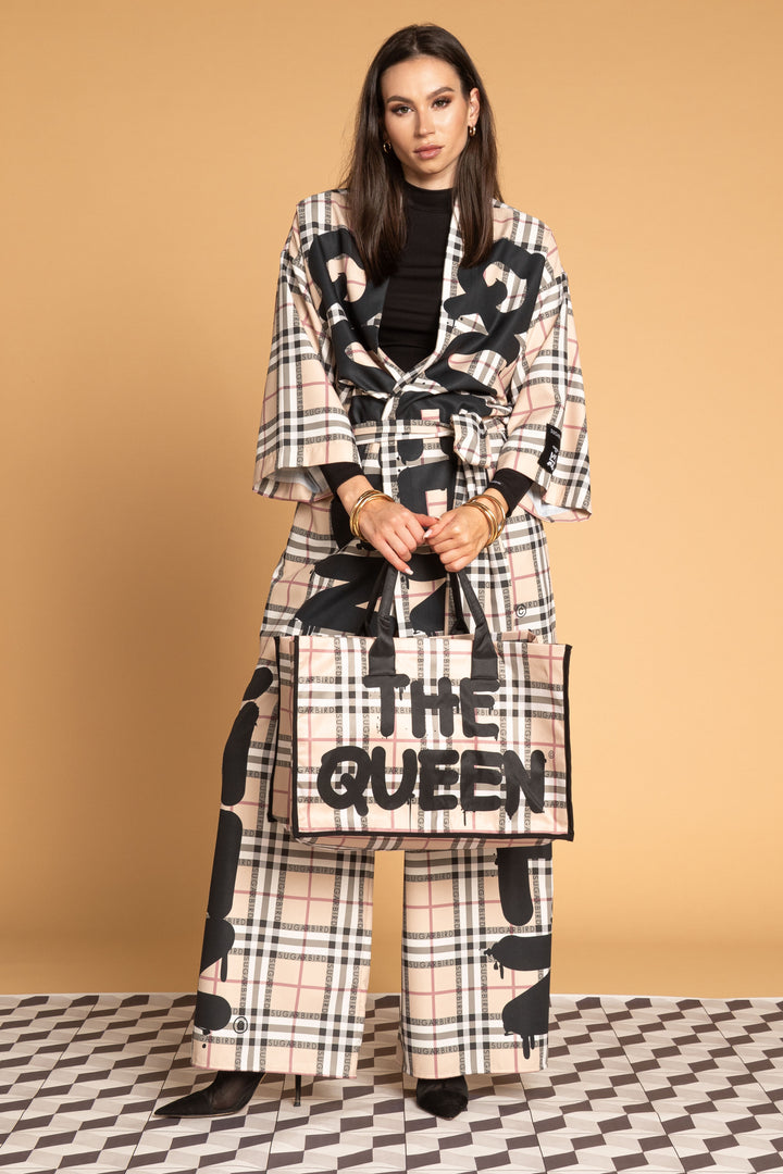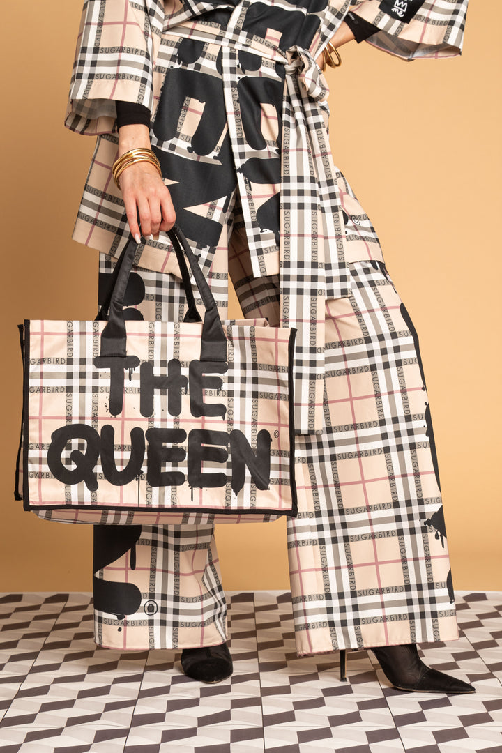 Fedezd fel az új LONDON QUEEN kollekciónk darabjait, melyet a bézs kockás minta időtlen eleganciája és az ikonikus QUEEN és SUGARBIRD feliratok kombinációja jellemez.