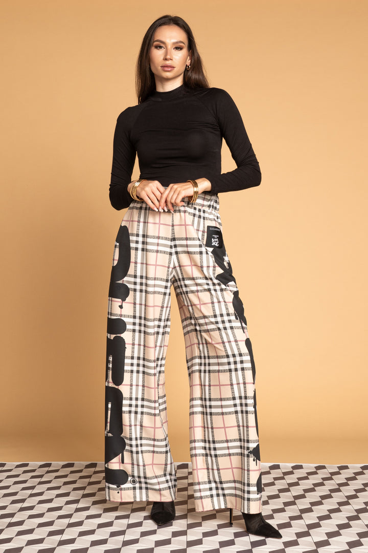 Maxi hosszúságú, egyenes, extra bő fazonú nadrág. A fazon különlegessége az egybe szabott oldala, melynek szűkítőibe zsebeket varrtunk. Dereka gumizott, elejére SUGARBIRD QUEEN ME feliratú címkét helyeztünk.