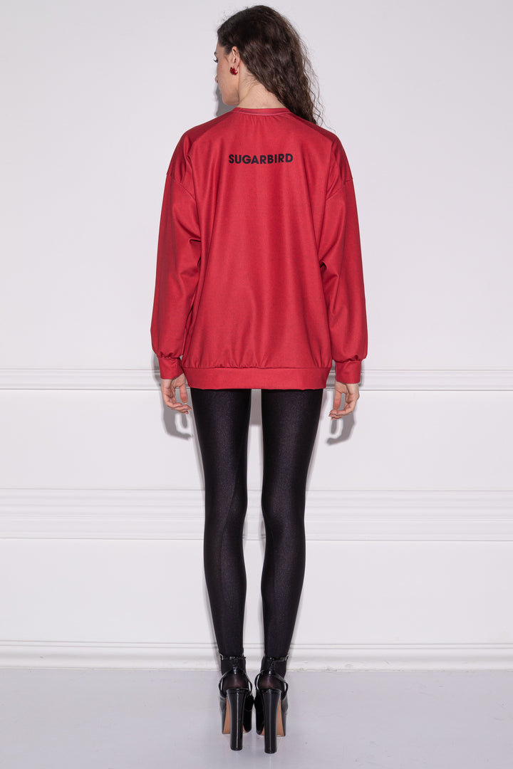 Hosszú ujjú, csípőig érő, bő fazonú pulóver. Zárt kerek nyakát, alját és ujja alját félbehajtott pántok szegik. Elejére SUGARBIRD feliratú címkét varrtunk.