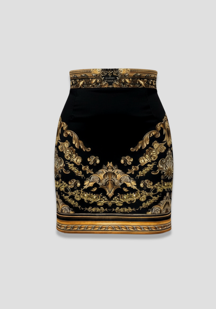 Combközép hosszúságú, alak követő, bélelt szoknya. Háta közepén zipzárral nyitható. Derekát széles, félbehajtott pánt szegi.