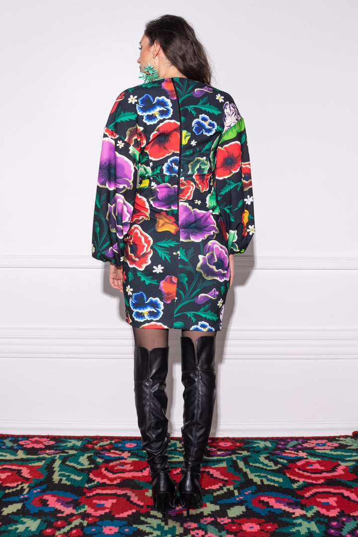 Combközép hosszúságú, hosszú és puffos ujjú ruha. Elején „V” kivágású és átlapolt, mell alatt, valamint az ujján hajtások formázzák. Háta közepén zipzárral nyitható. Elejére SUGARBIRD feliratú címkét varrtunk.