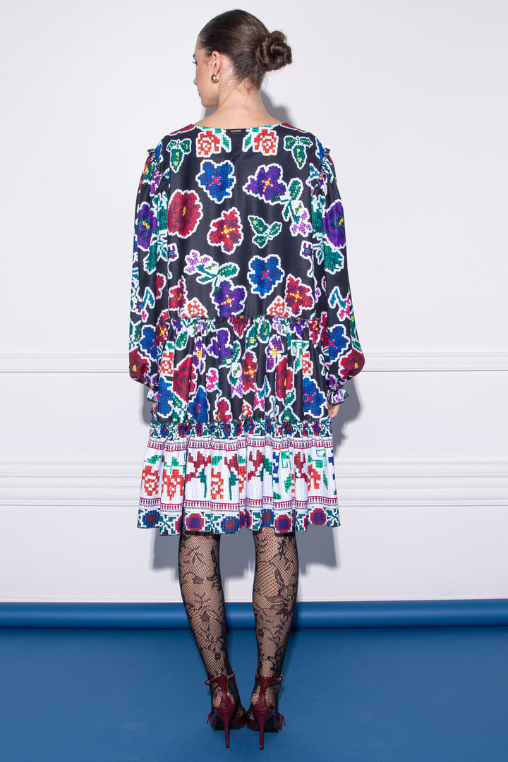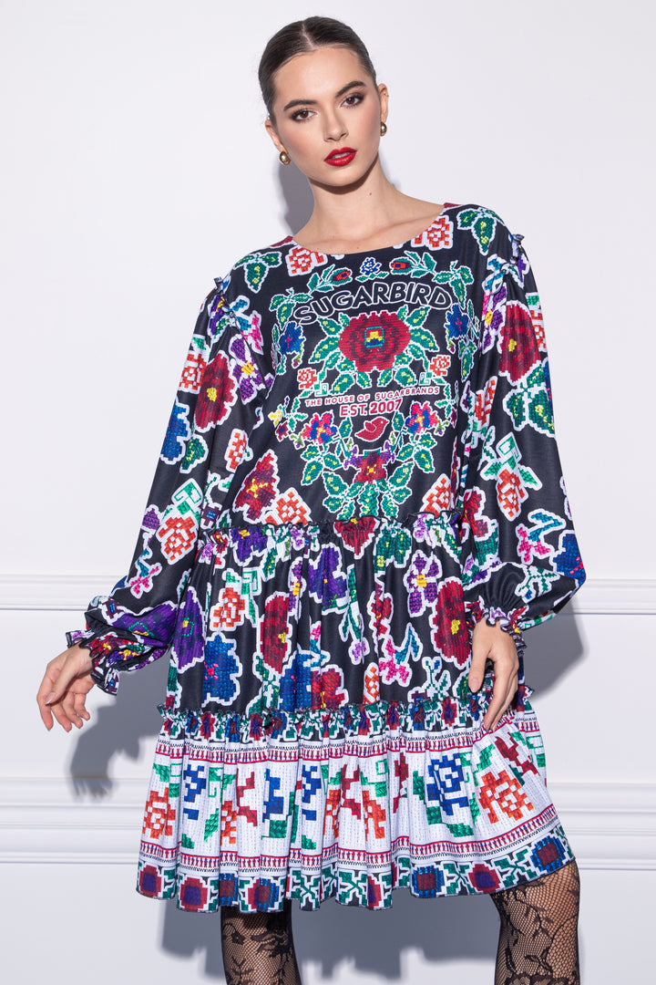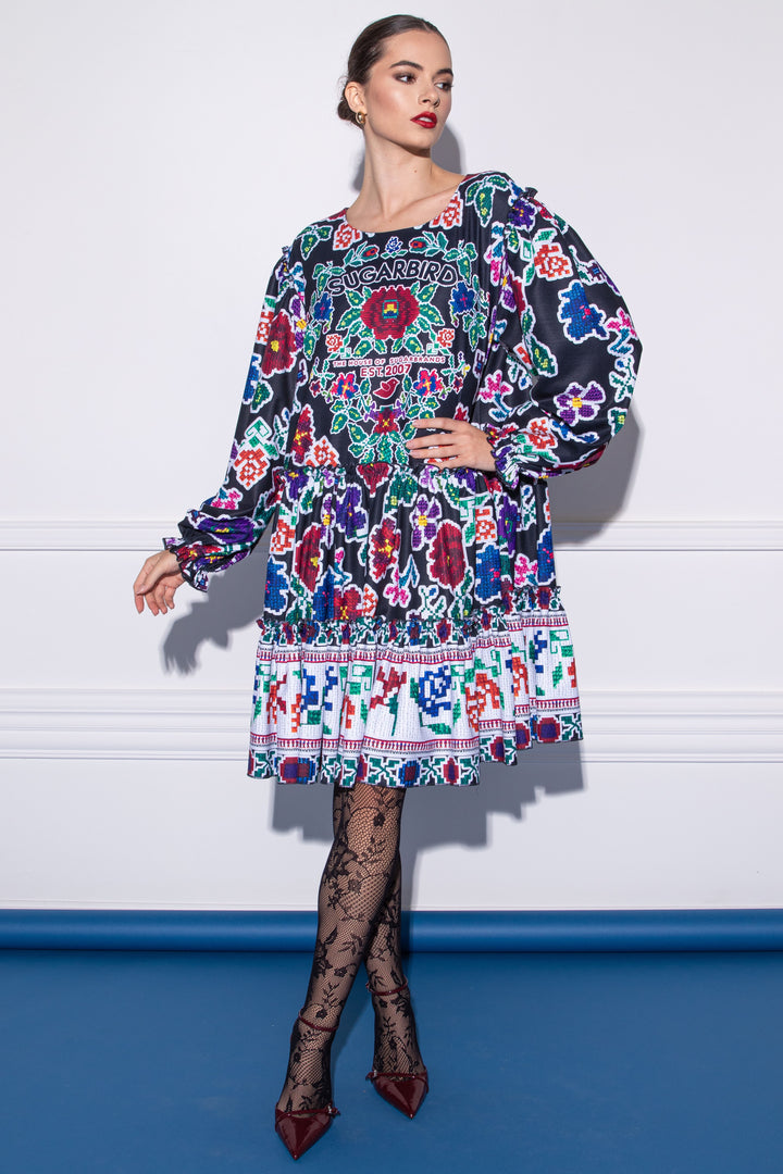 Térd feletti hosszúságú, hosszú ujjú, laza fazonú ruha. Szoknya részét széles és húzott fodrok alkotják, ujja alja gumizott. Vállait keskeny, húzott fodor díszíti. A hátára SUGARBIRD feliratú címkét varrtunk.