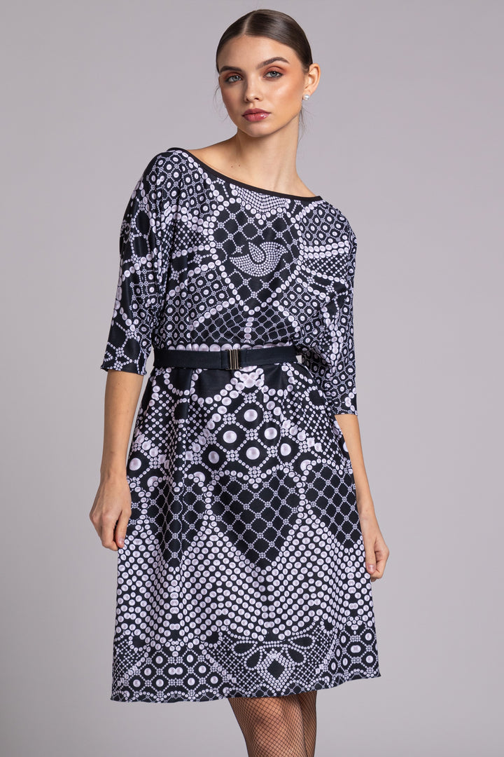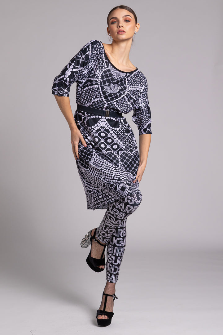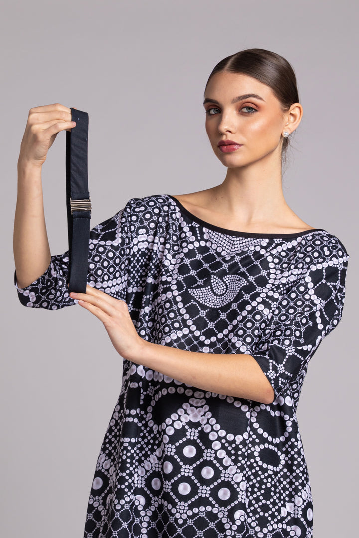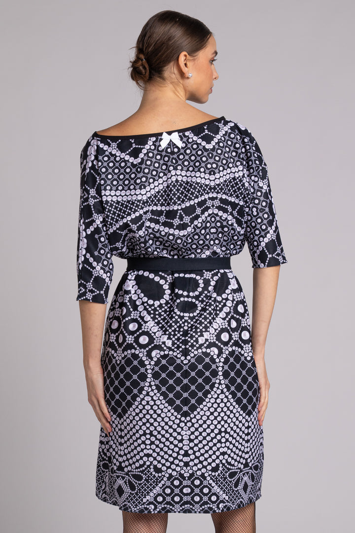 Térd feletti hosszúságú, háromnegyedes ujjú, laza, tunika fazonú ruha. Szélesen kivágott nyakköre gumis pánttal szegett. Hátán fehér masnis kellék és SUGARBIRD feliratú címke díszíti. A ruhához egy külön álló gumis öv is készült, amely fém övcsattal záródik.