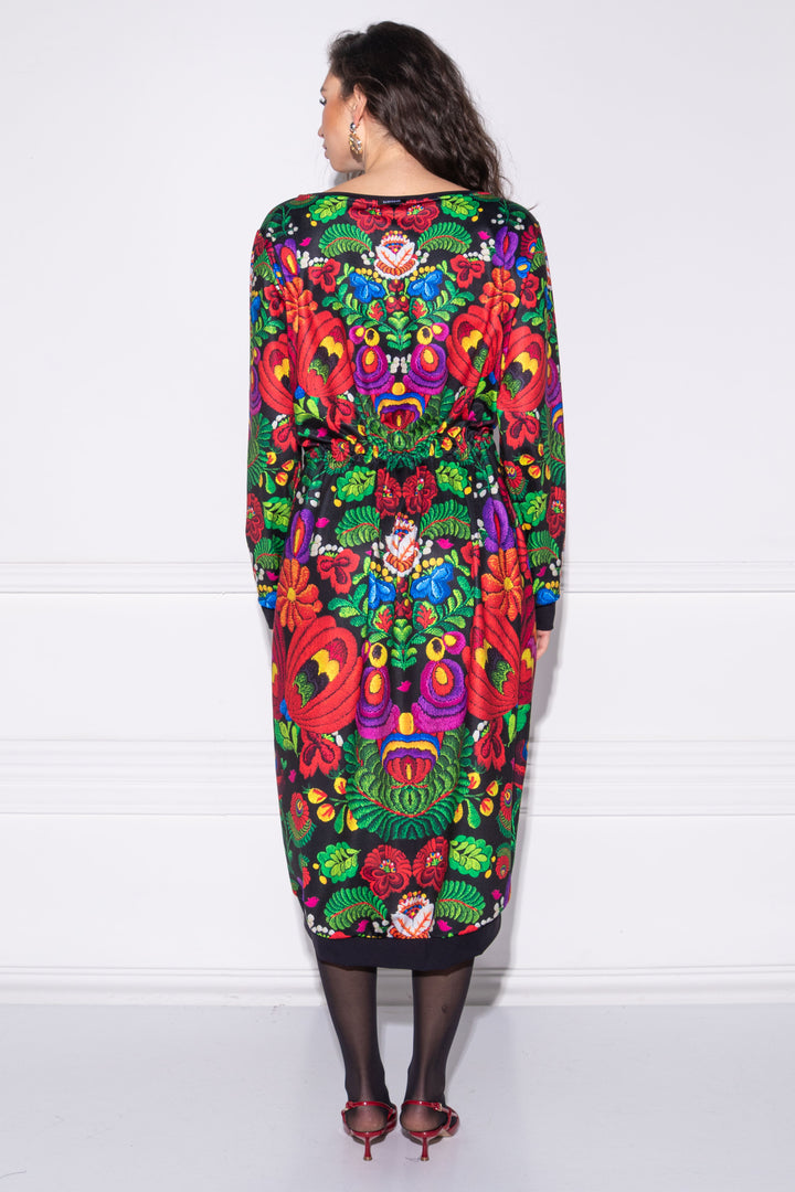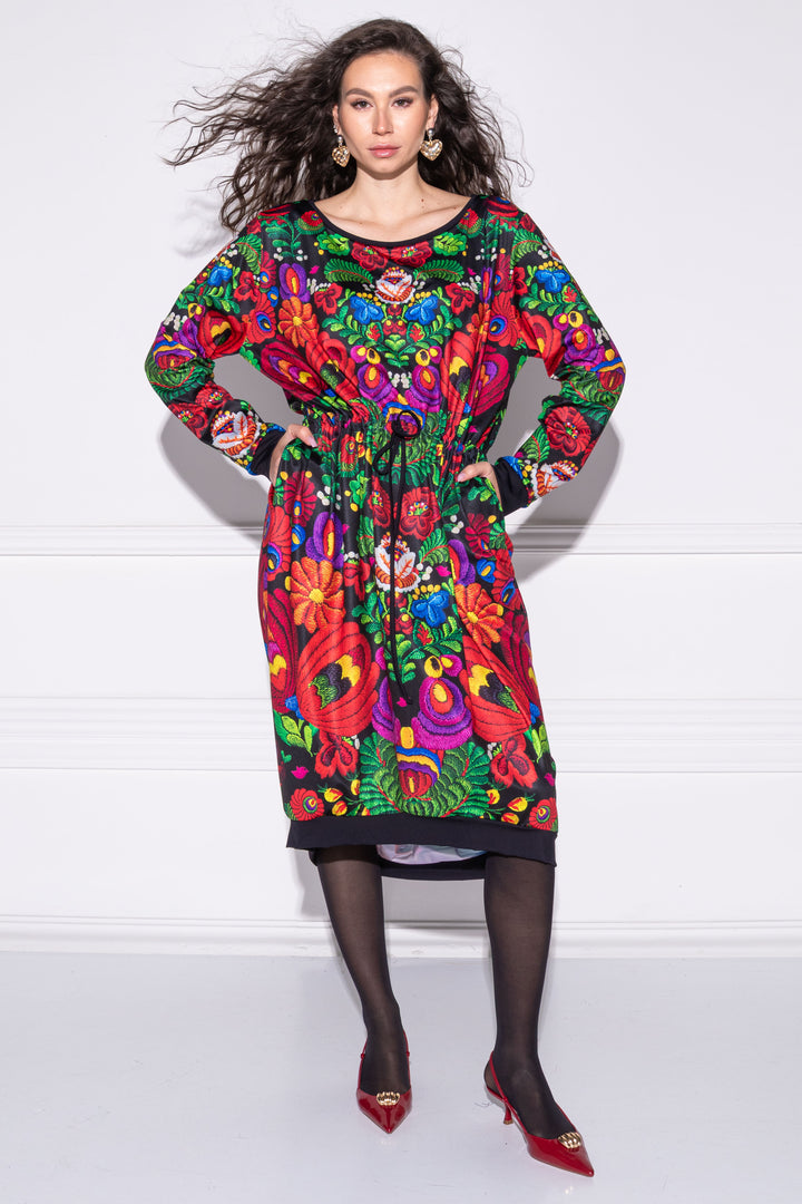 Hosszú ujjú, bő fazonú, vádliközép hosszúságú ruha. Oldalaiba zsebeket helyeztünk. Széles, kerek nyakát, alját és ujja alját félbehajtott pántok szegik. Dereka egy kötő segítségével szűkíthető. Hátán SUGARBIRD feliratú címkével díszítettük.