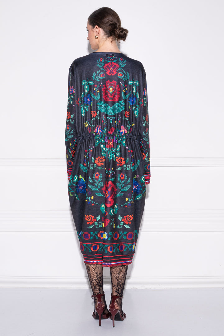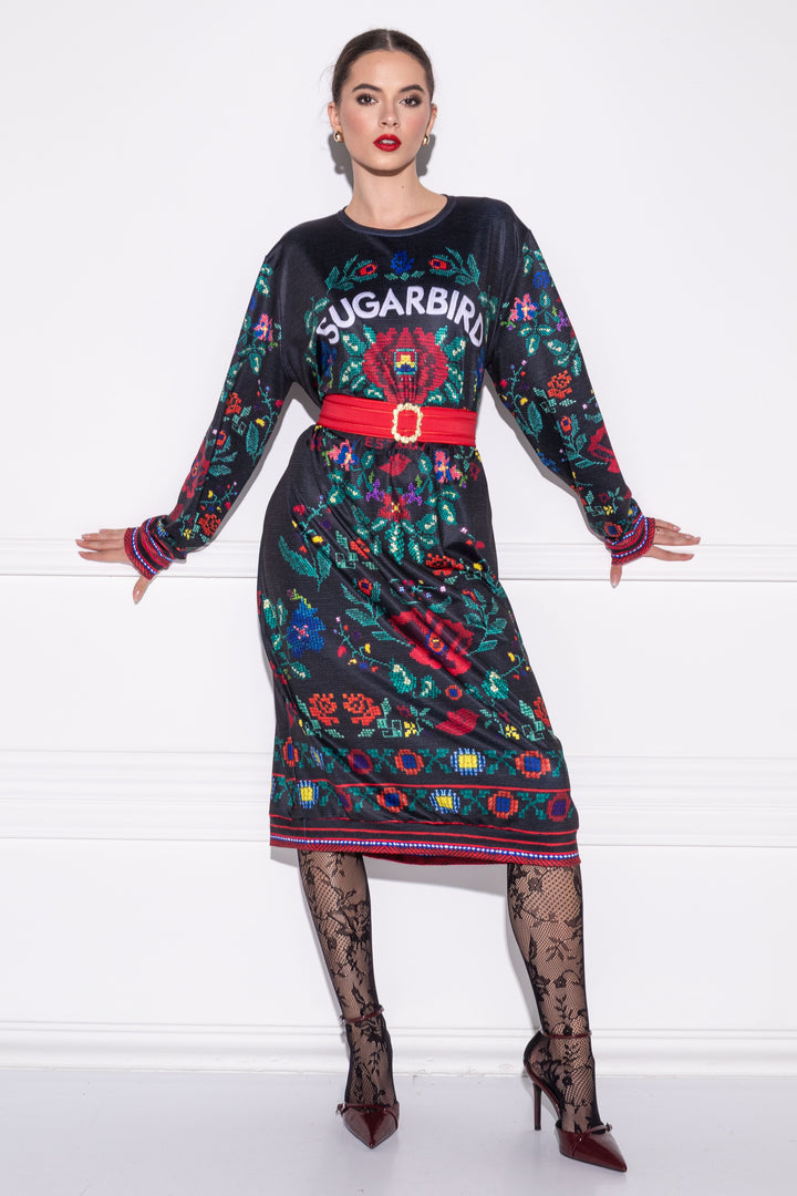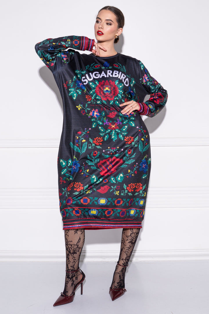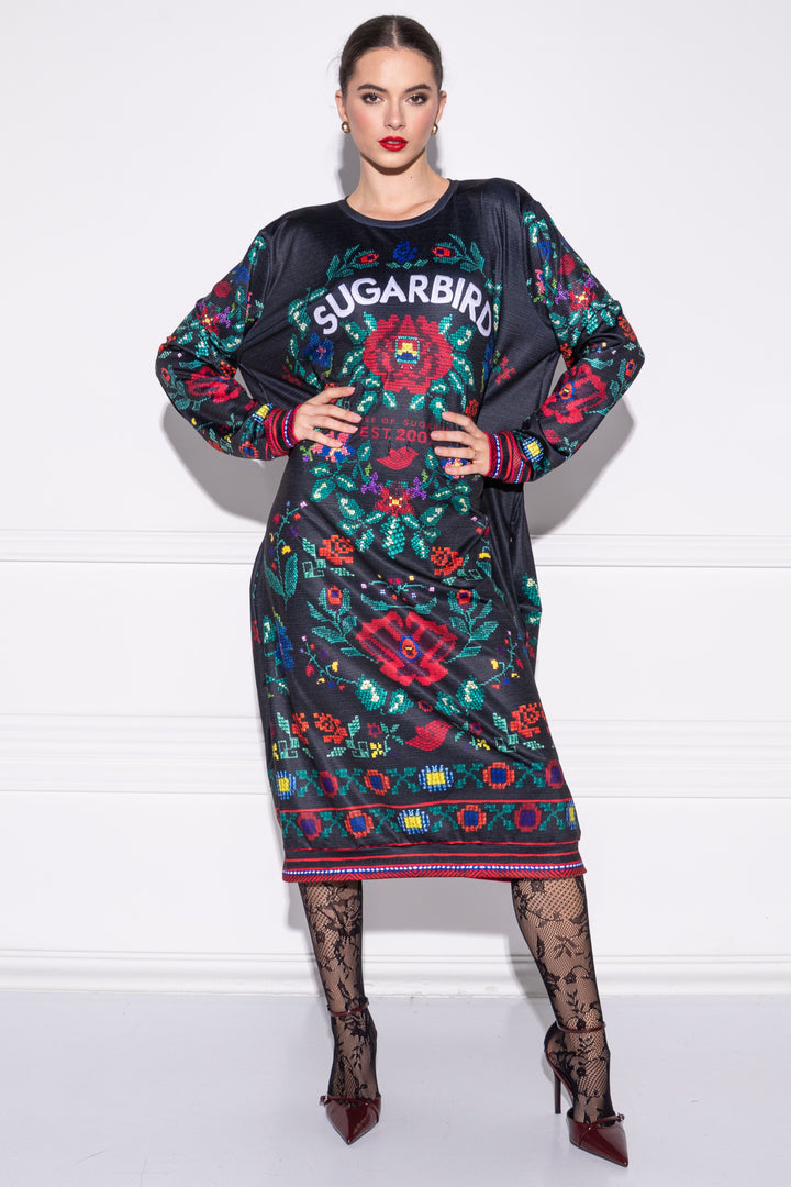 Hosszú ujjú, bő fazonú, vádliközép hosszúságú ruha. Oldalaiba zsebeket helyeztünk. Széles, kerek nyakát, alját és ujja alját félbehajtott pántok szegik. Háta derék magasságban gumizott, nyakánál SUGARBIRD feliratú címkével díszítettük.