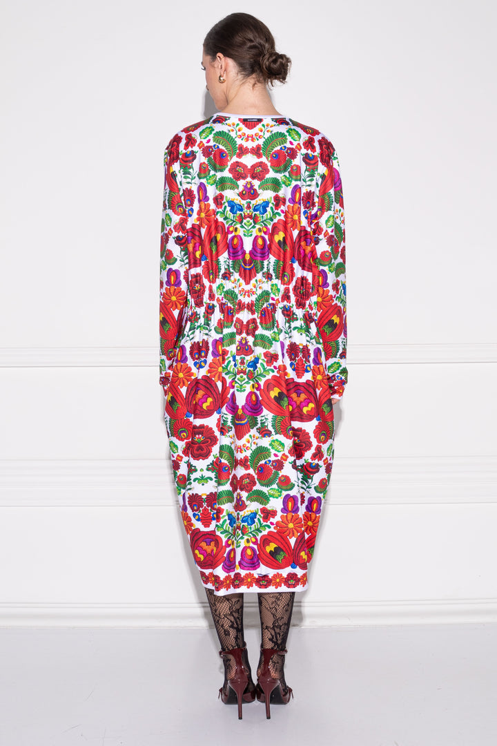 Hosszú ujjú, bő fazonú, vádliközép hosszúságú ruha. Oldalaiba zsebeket helyeztünk. Széles, kerek nyakát, alját és ujja alját félbehajtott pántok szegik. Háta derék magasságban gumizott, nyakánál SUGARBIRD feliratú címkével díszítettük.