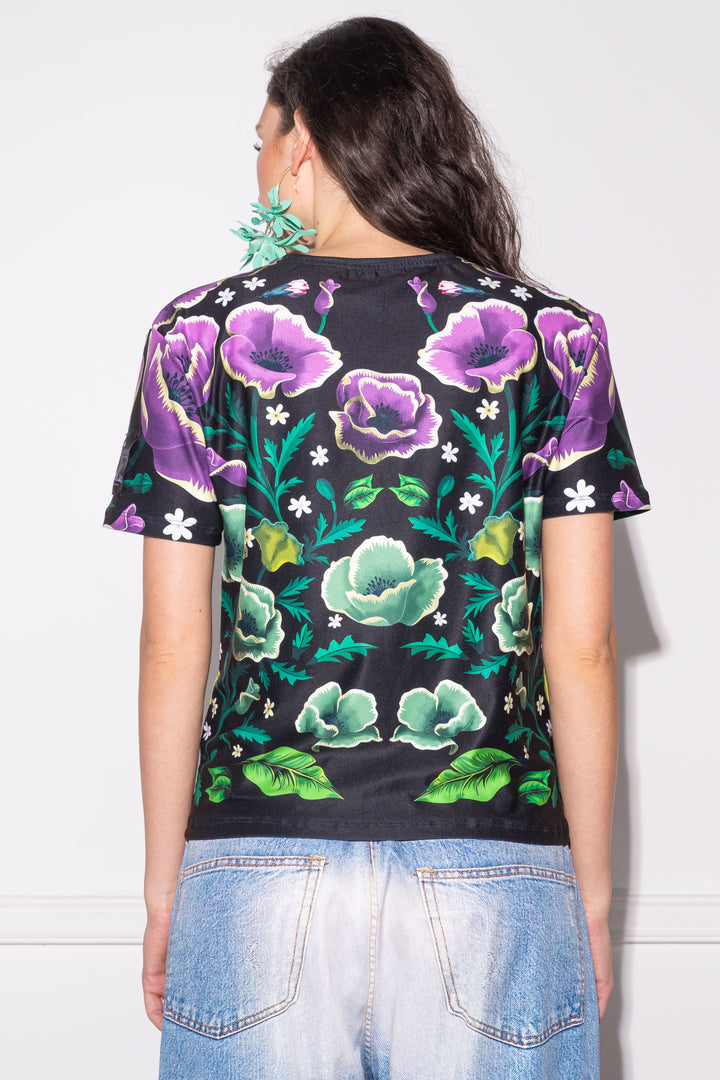 Rövid ujjú, laza fazonú, csípő fölé érő felső. Kerek, zárt nyaka félbehajtott pánttal szegett. Ujjára SUGARBIRD feliratú címkével díszítettük.