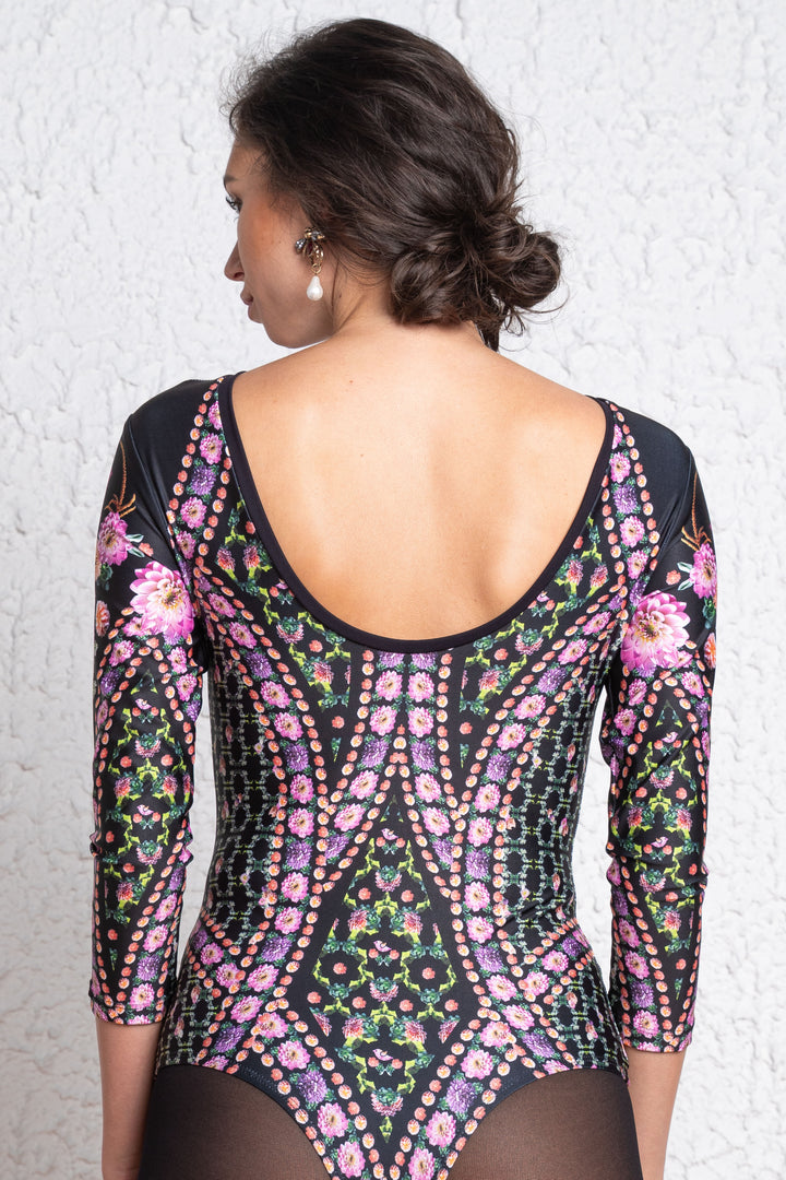 Elől zárt, hátán mély íves nyakkivágású, alak követő, háromnegyedes ujjú body, melynek nyakkörét félbehajtott pánt szegi. Alul gumizott combrésszel, ülepén állítható kapoccsal záródik. Háta akár az elejének is hordható kedv szerint. Bal ujjára SUGARBIRD feliratú címkét varrtunk.