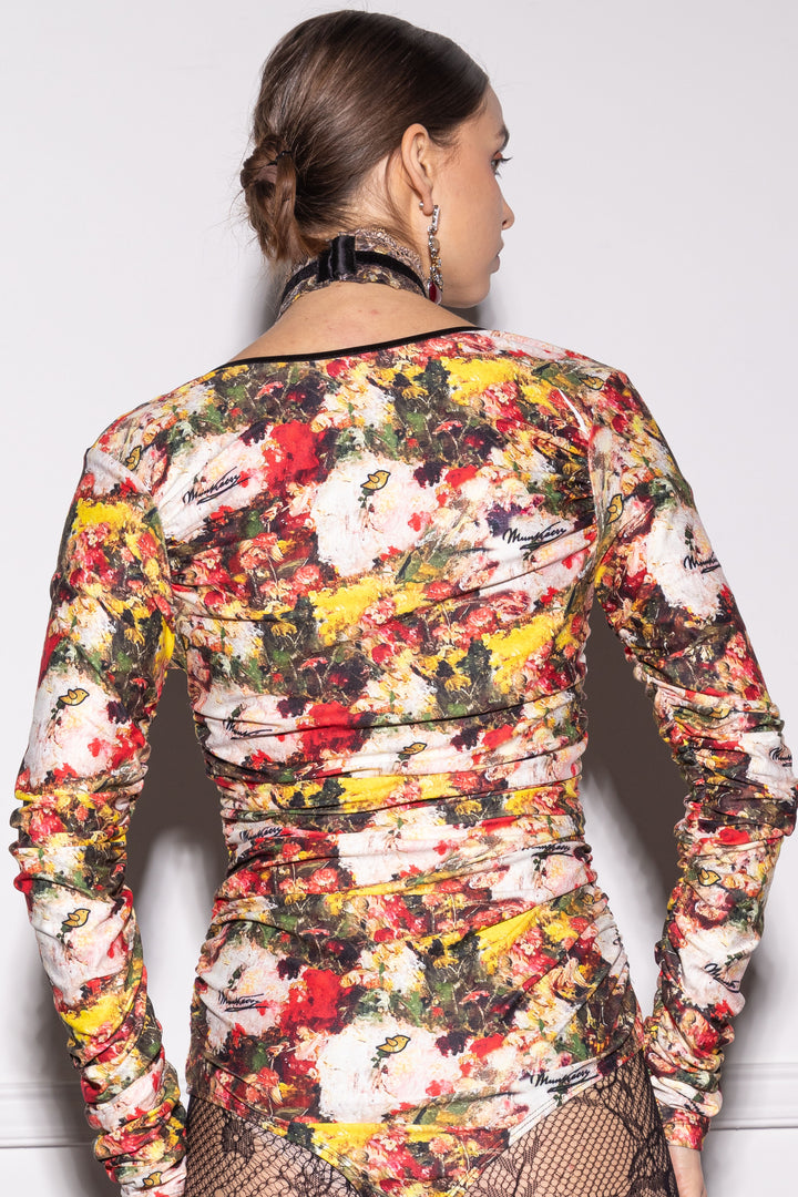 Elején mély, íves nyakkivágású, alak követő, hosszú ujjú body, melynek nyakkörét keskeny pánt szegi. Alul gumizott combrésszel, ülepén állítható kapoccsal záródik. Háta akár az elejének is hordható kedv szerint. Oldala és az ujja ráncolt.
