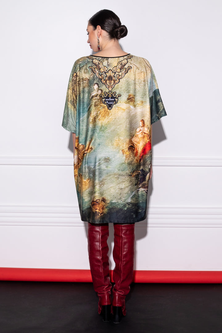 Rövid ujjú, térdig érő, extra laza és bő fazonú tunika. Zárt kerek nyaka keskeny pánttal szegett.