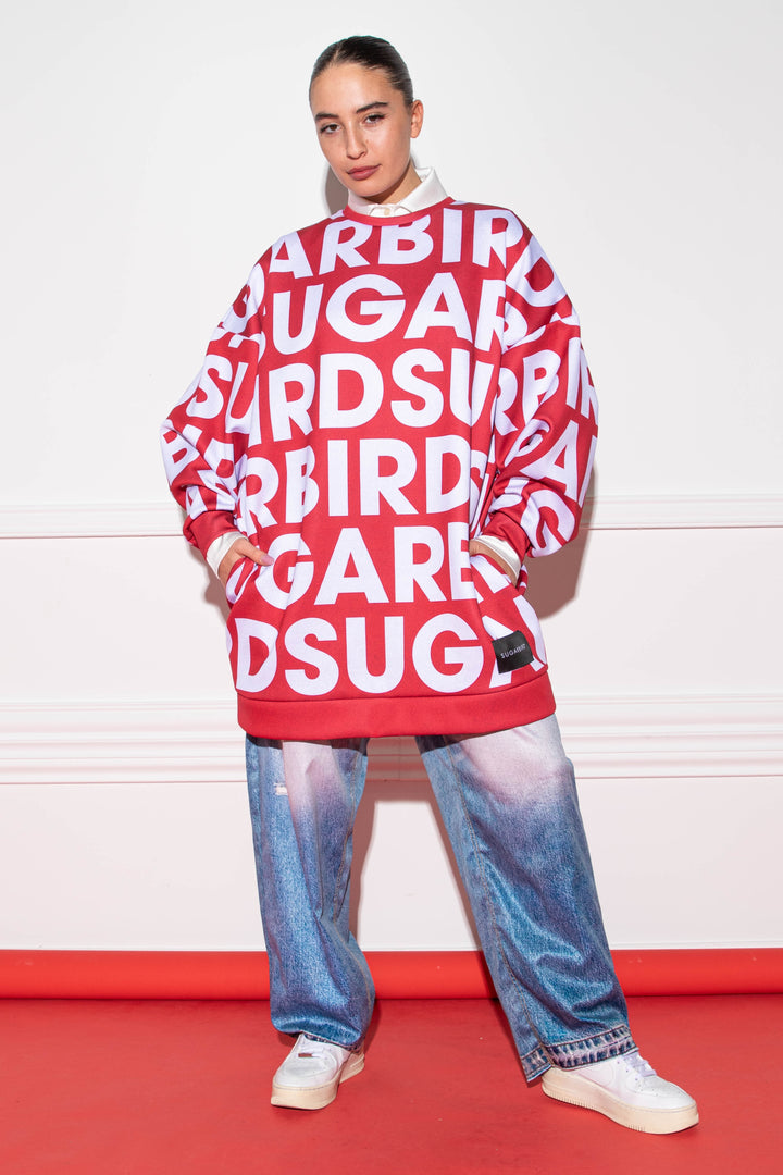 Kedvelt fazonunkat piros alapon, fehér színű, óriás SUGARBIRD feliratok printelt mintája díszíti.