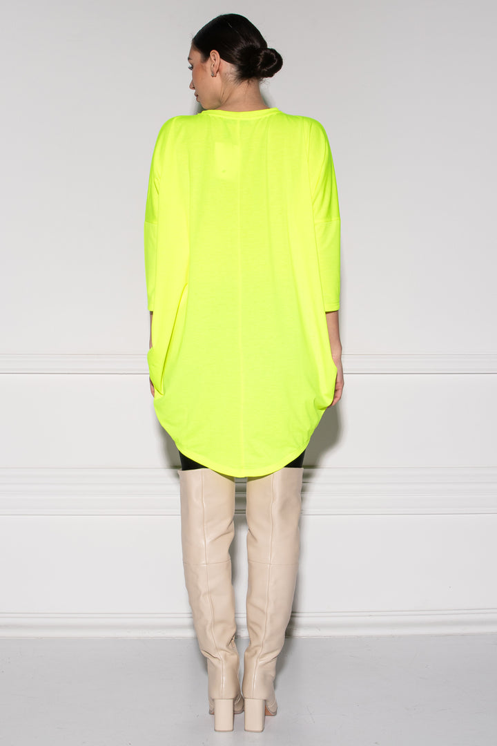 Combközépig érő, hosszú ujjú, bő fazonú tunika. Kerek és zárt kivágású nyaka keskeny pánttal szegett.