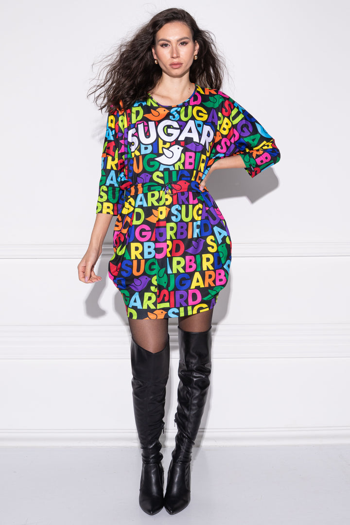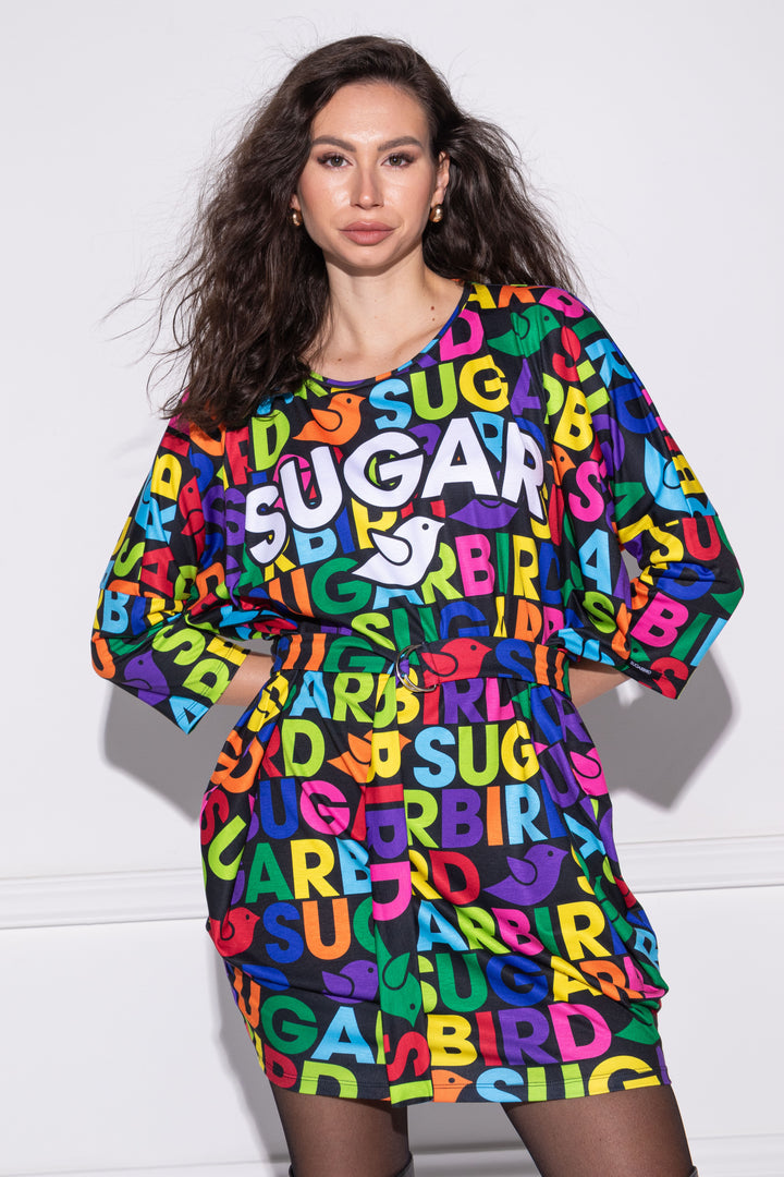 Combközépig érő, hosszú ujjú, bő fazonú tunika. Kerek és zárt kivágású nyaka keskeny pánttal szegett. Hosszú kötőjével derékra szűkíthető a fazon. Ujján SUGARBIRD feliratú címkével díszítettük.