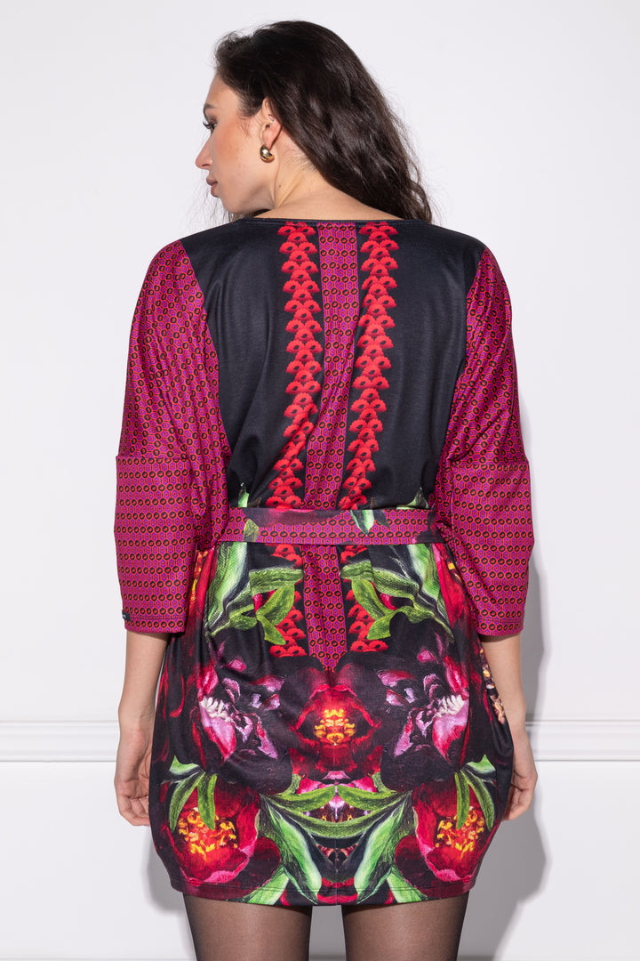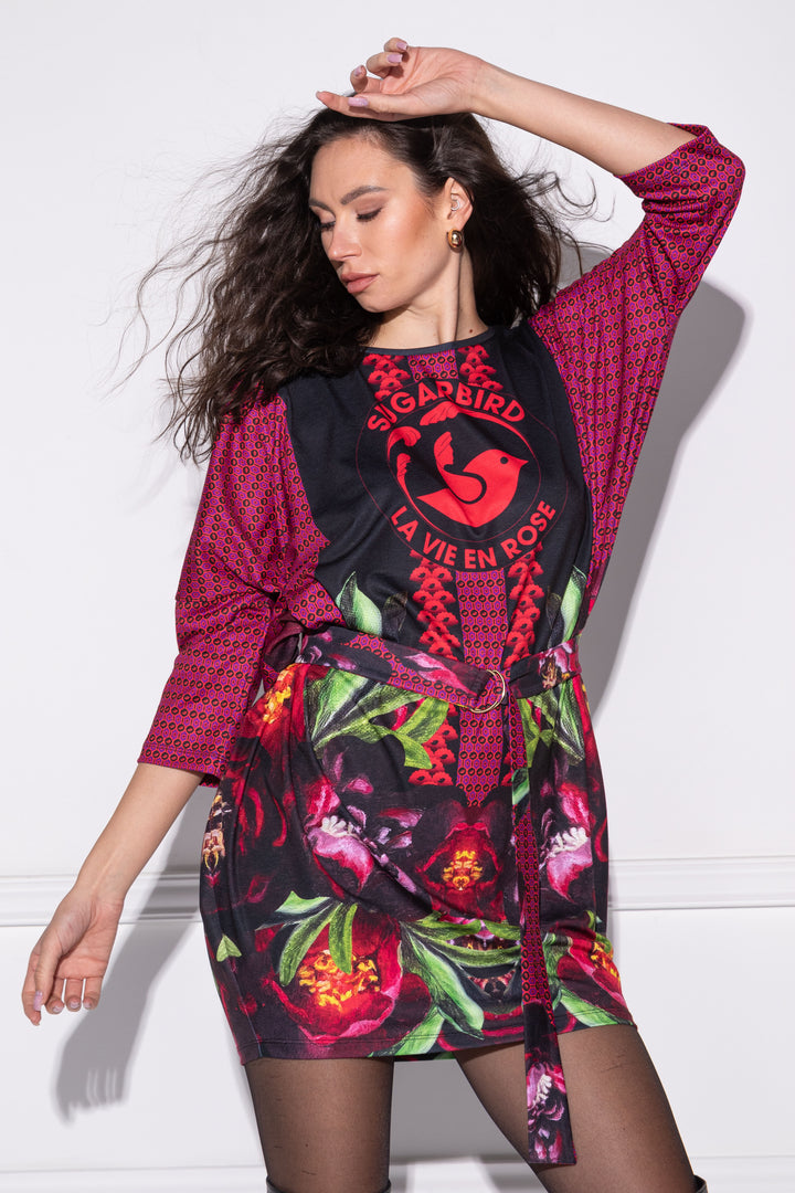 Combközépig érő, hosszú ujjú, bő fazonú tunika. Kerek és zárt kivágású nyaka keskeny pánttal szegett. Hosszú kötőjével derékra szűkíthető a fazon. Ujján SUGARBIRD feliratú címkével díszítettük.