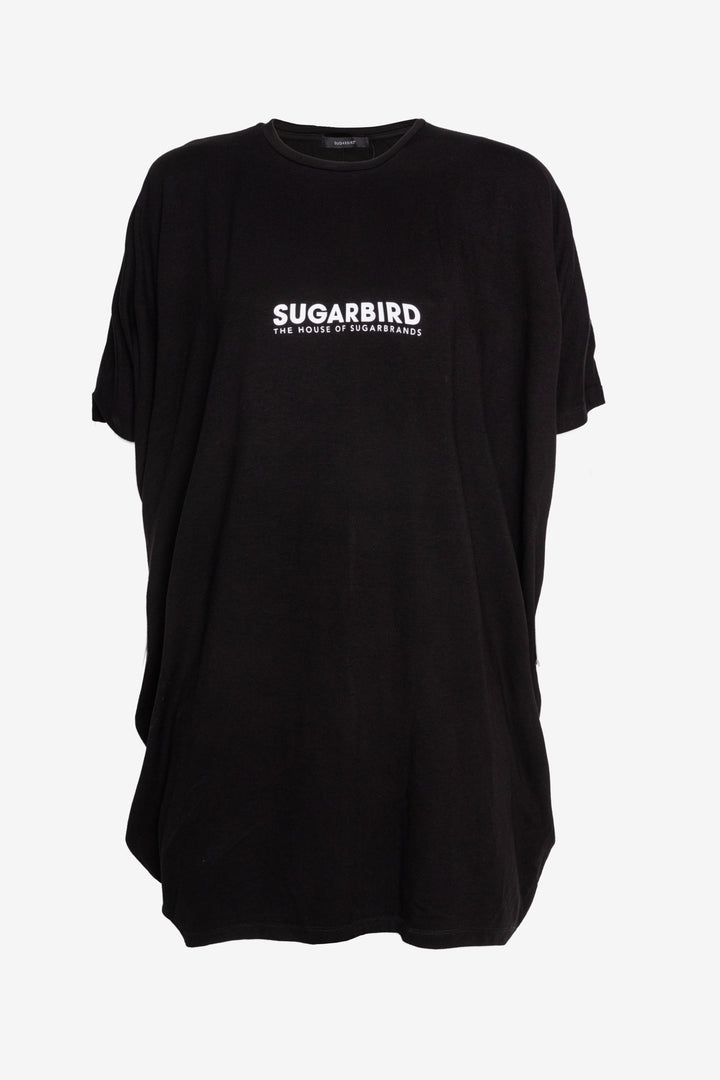 Combközépig érő, rövid ujjú, bő fazonú tunika. Kerek és zárt kivágású nyaka félbe hajtott pánttal szegett. Oldalában SUGARBIRD feliratú címke díszíti.