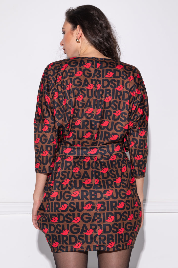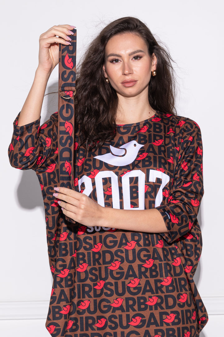 Combközépig érő, hosszú ujjú, bő fazonú tunika. Kerek és zárt kivágású nyaka keskeny pánttal szegett. Hosszú kötőjével derékra szűkíthető a fazon. Ujján SUGARBIRD feliratú címkével díszítettük.
