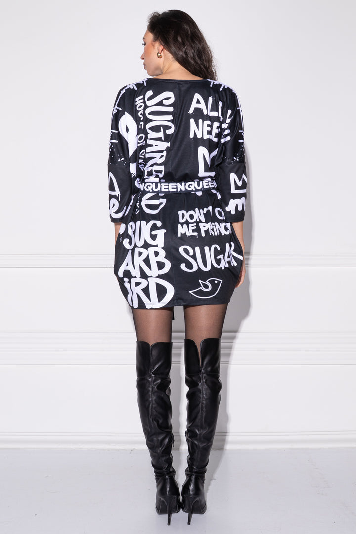 Combközépig érő, hosszú ujjú, bő fazonú tunika. Kerek és zárt kivágású nyaka keskeny pánttal szegett. Hosszú kötőjével derékra szűkíthető a fazon. Ujján SUGARBIRD feliratú címkével díszítettük.
