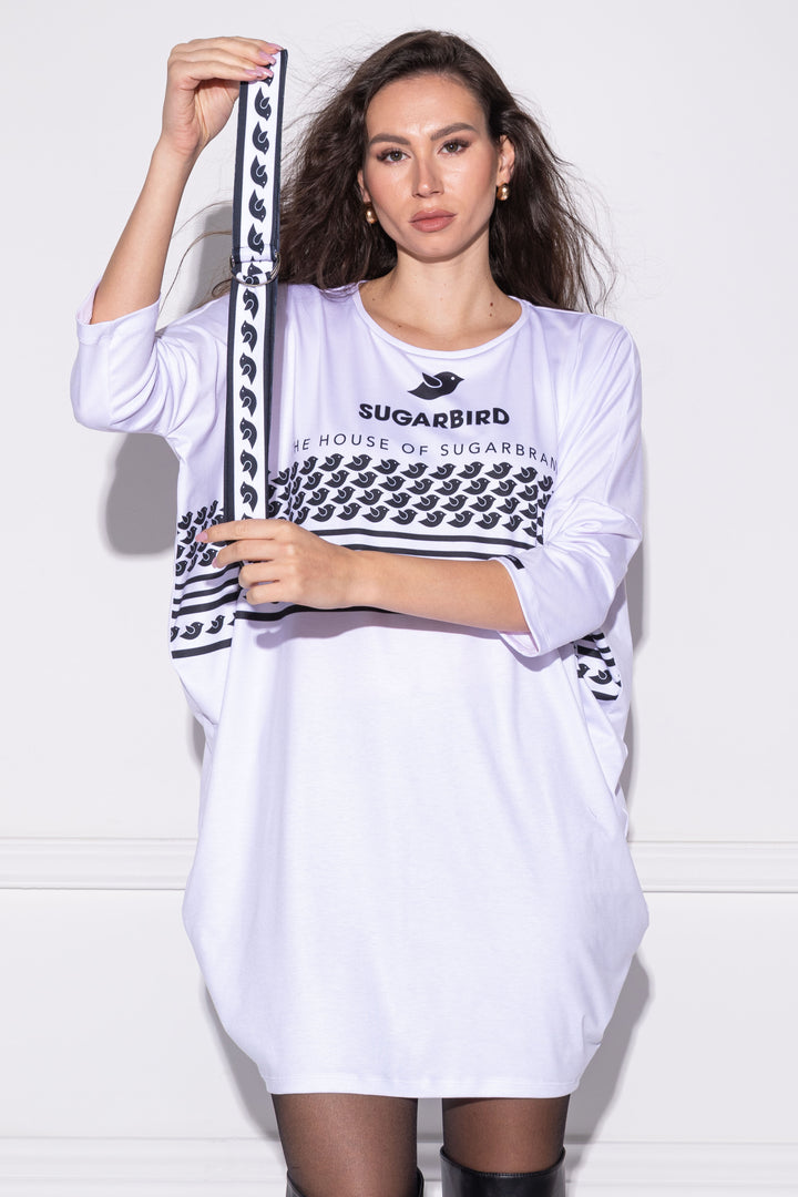 Combközépig érő, hosszú ujjú, bő fazonú tunika. Kerek és zárt kivágású nyaka keskeny pánttal szegett. Hosszú kötőjével derékra szűkíthető a fazon. Ujján SUGARBIRD feliratú címkével díszítettük.